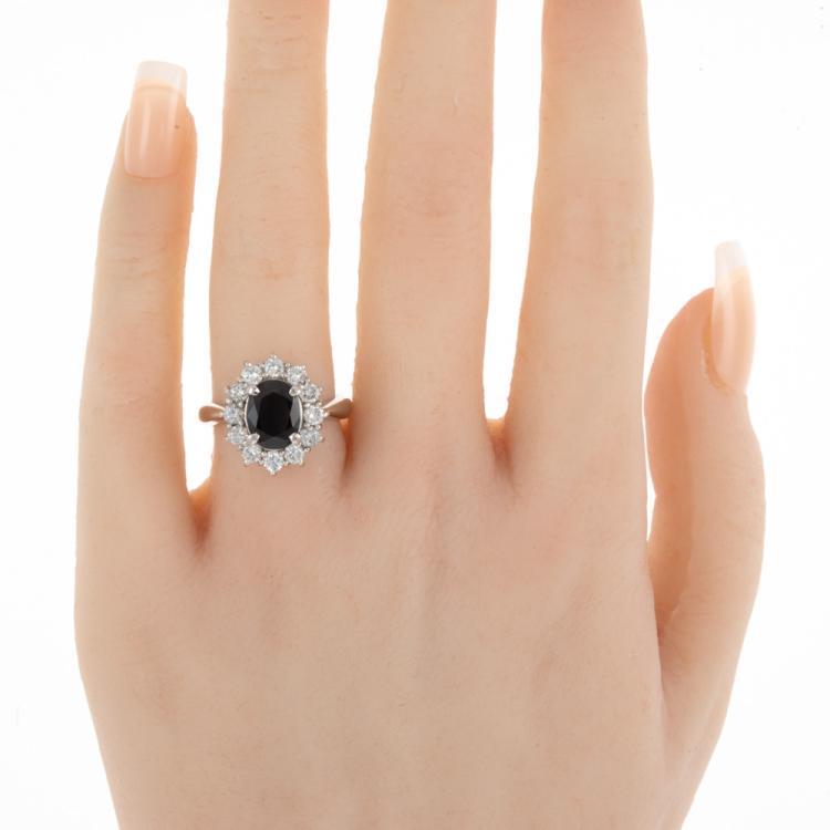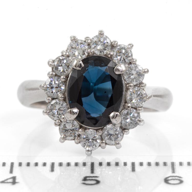 Sapphire and Diamond ring with oval shape Natural blue Sapphire of 1.58ct and Natural Diamonds totalling 0.86ct (Estimated grading: G- H VS-SI). Platinum 900. Ring size L. Band width: 3.25mm - 3.38mm. Weight: 8.6g. (Pre-owned)
