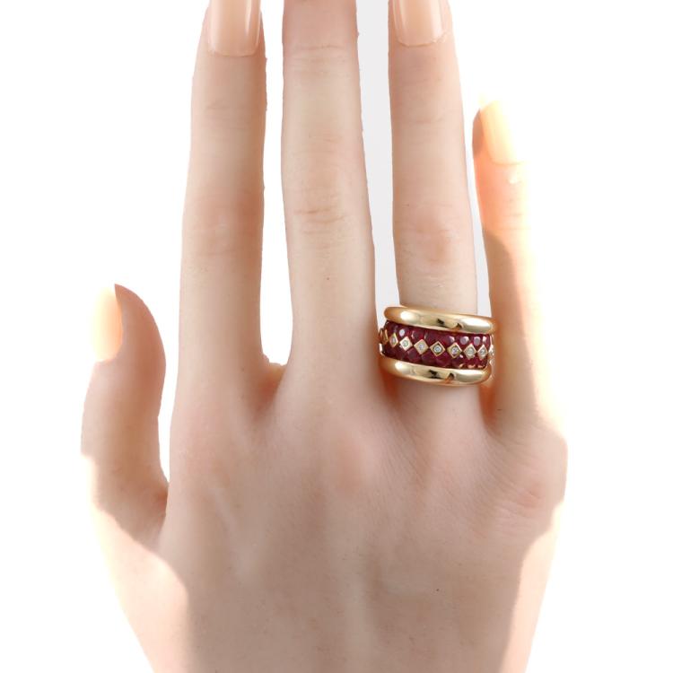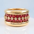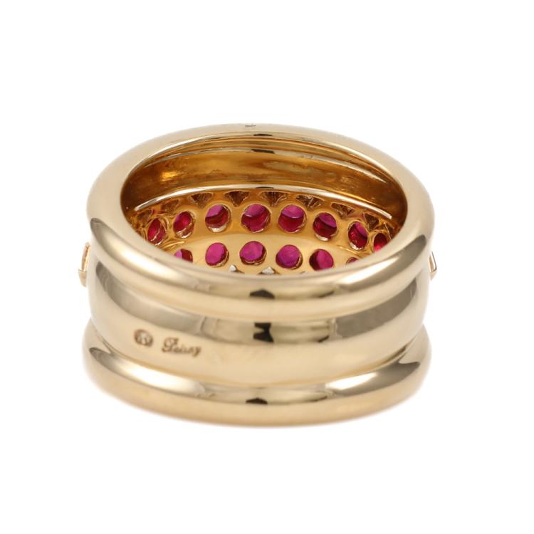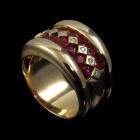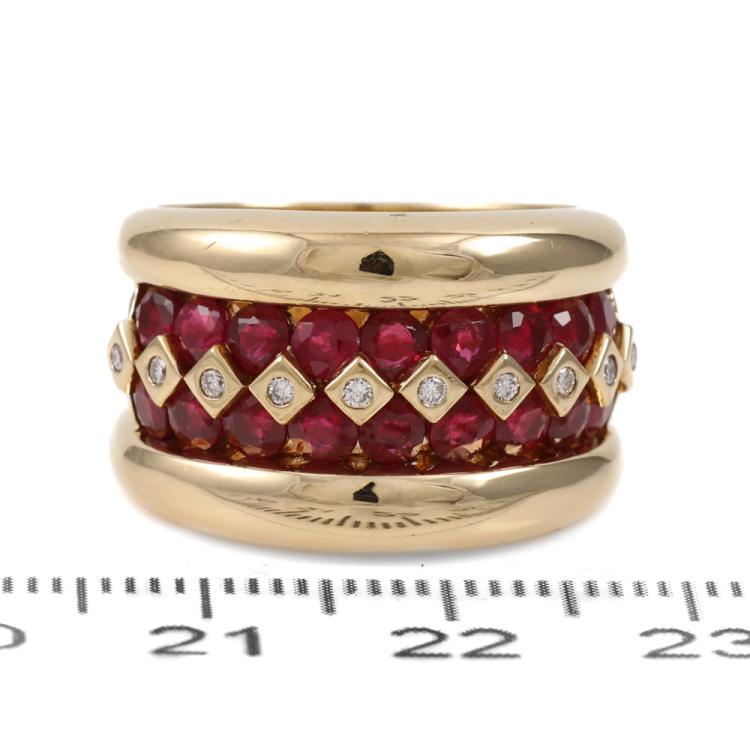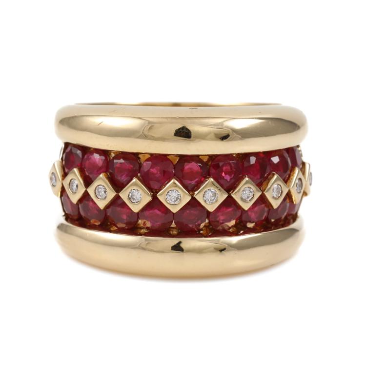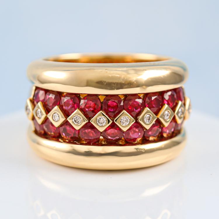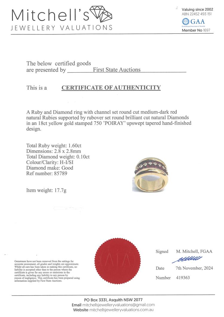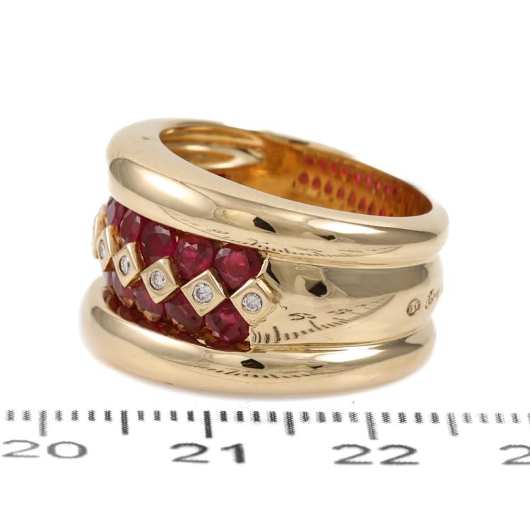 Ruby and Diamond ring with round Natural Rubies totalling 1.60ct with round Natural Diamonds totalling 0.10ct. 18ct yellow gold. Ring size: M - ring resizing is not recommended. Band width: 10.0mm - 12.0mm. Weight: 17.7g. Stamped "Poiray". With Certificate #419363. (Pre-owned)