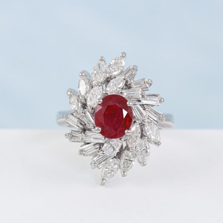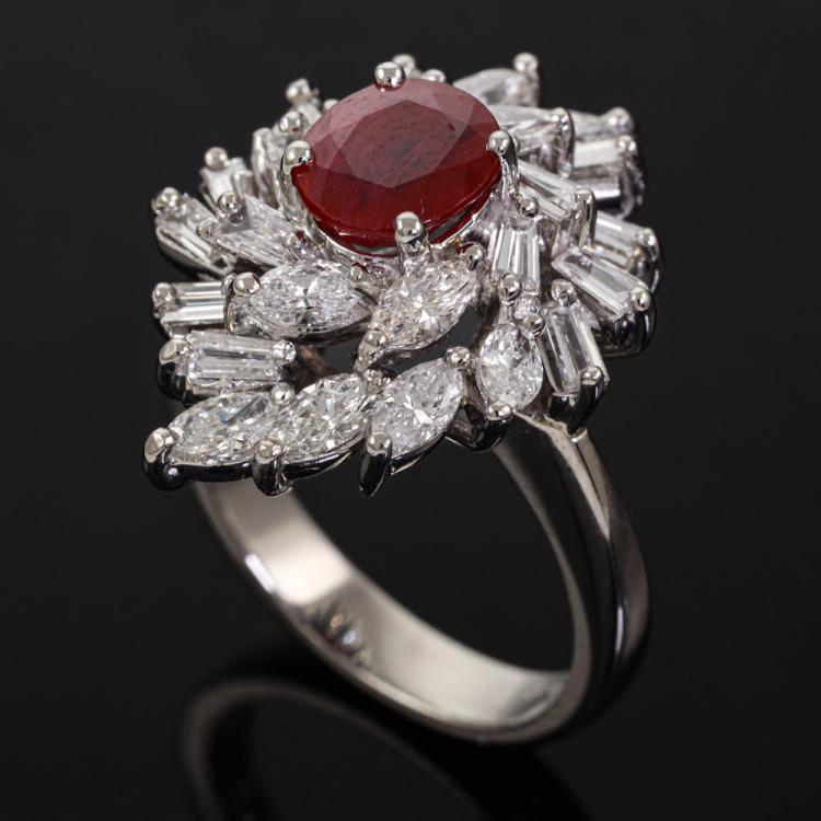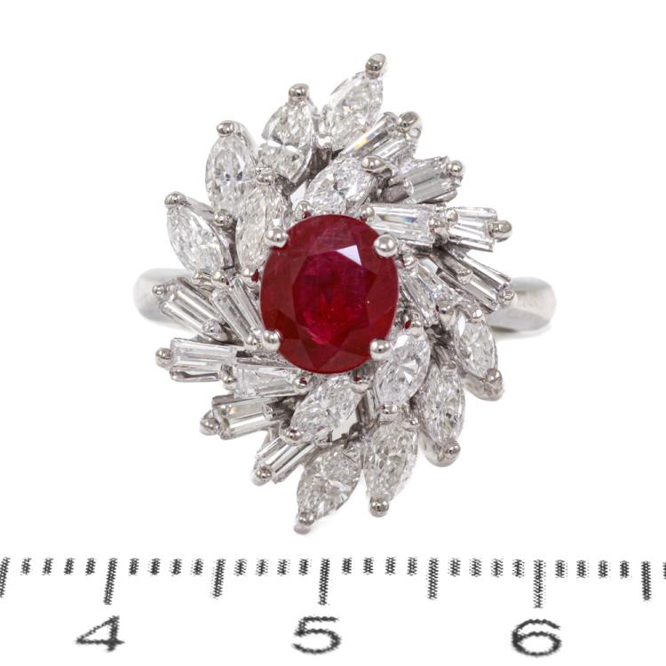 Ruby and Diamond ring with oval Natural Ruby totalling of 1.64ct and marquise & baguette cut Natural Diamonds totalling 1.92ct (Estimated grading: G-H SI). Platinum-900. Ring size: L1/2. Band width: 3.4mm - 1.8mm. Weight: 12.4g. (Pre-owned)
