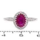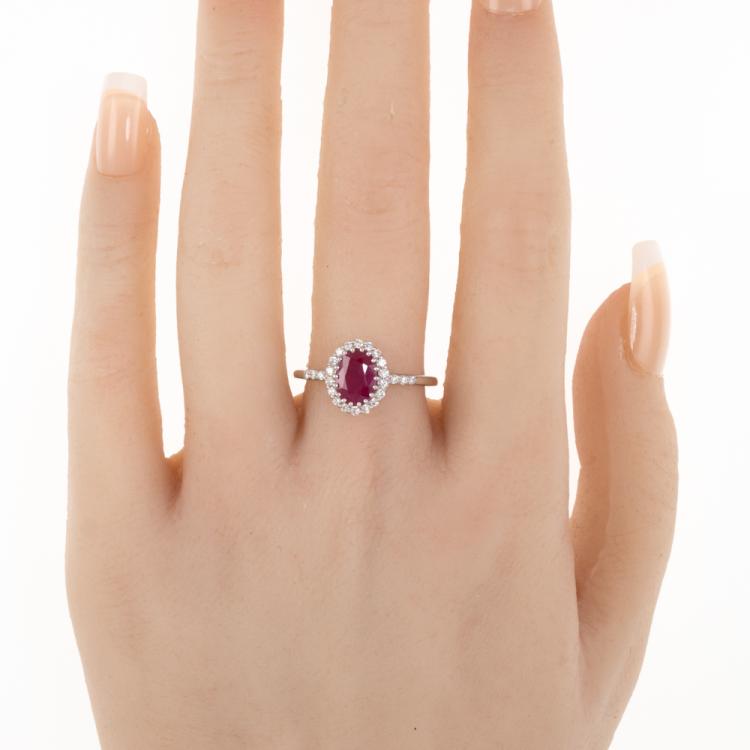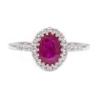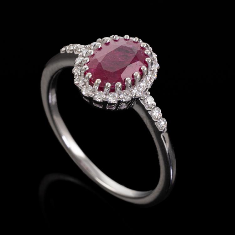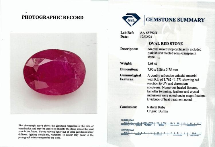 Ruby and Diamond ring with an oval shape natural Burmese Ruby of 1.68ct (With GSL Gemstone Report #AA68792/4. Origin: Burma) and round natural Diamonds totalling approximately 0.20ct. 18ct white gold. Ring size O1/2. Band width: 1.5mm. Weight: 3.5g. (As New)