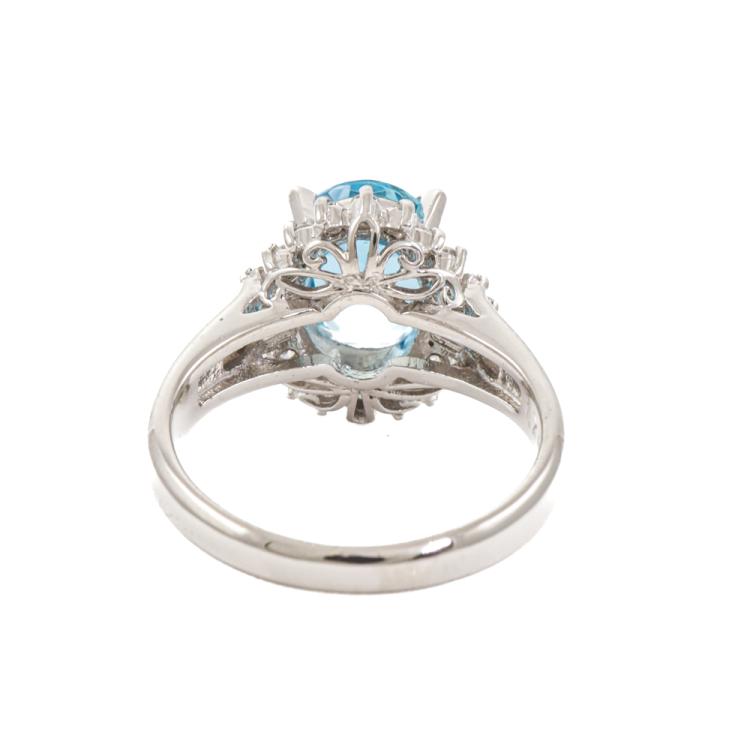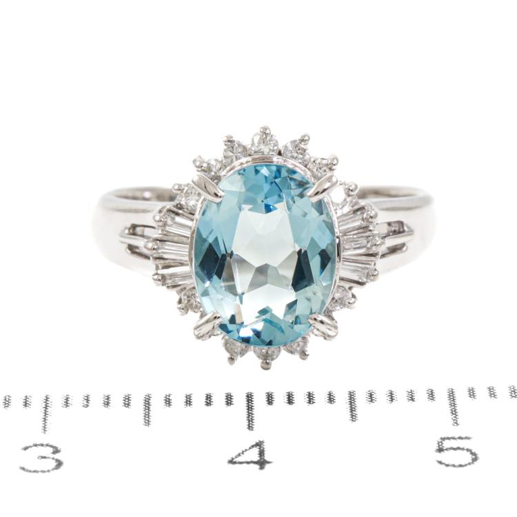 Aquamarine and Diamond ring with oval shape Natural Aquamarine of 1.70ct and round & baguette cut Natural Diamonds totalling 0.22ct. Platinum-900. Ring size: J1/2. Band width: 2.5mm-3.5mm. Weight: 6.0g. (Pre-owned)