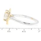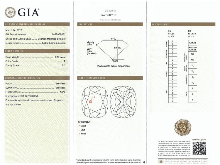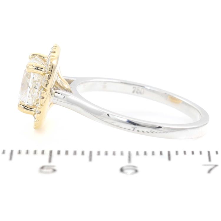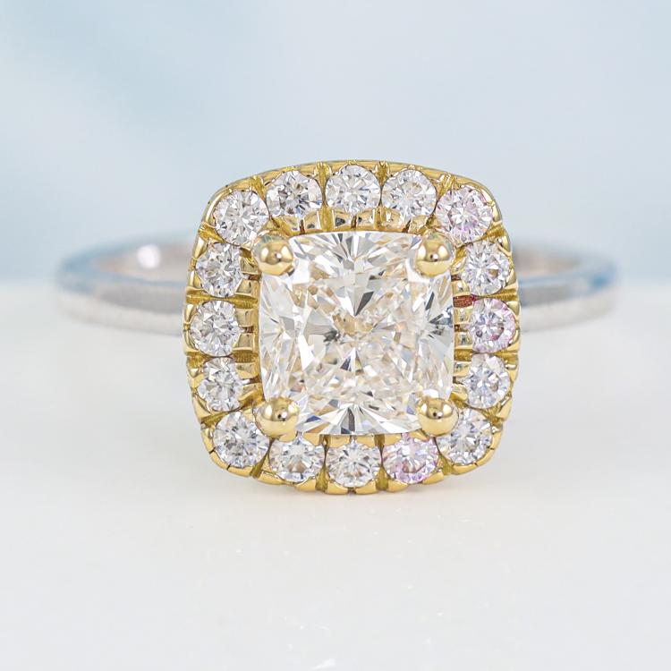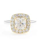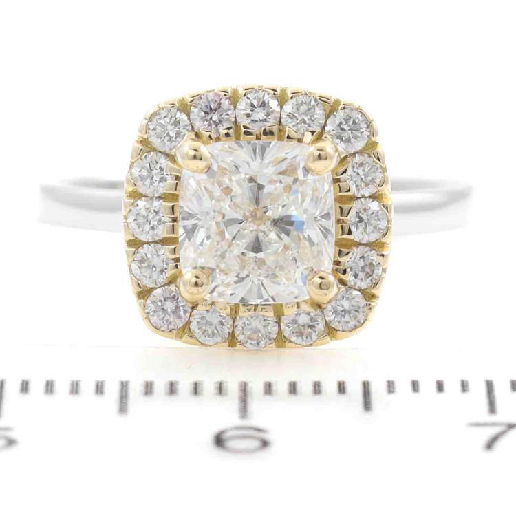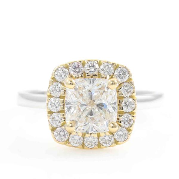 Diamond halo ring with centre cushion cut Natural Diamond of 1.70ct (with GIA Report graded as E SI1 #1425609051) and surrounding round Natural Diamonds totalling 0.39ct (Estimated grading: G-H VS-SI). 18ct yellow and white gold. Ring size: L1/4. Band width: 1.9mm. Weight 4.8g. (New)