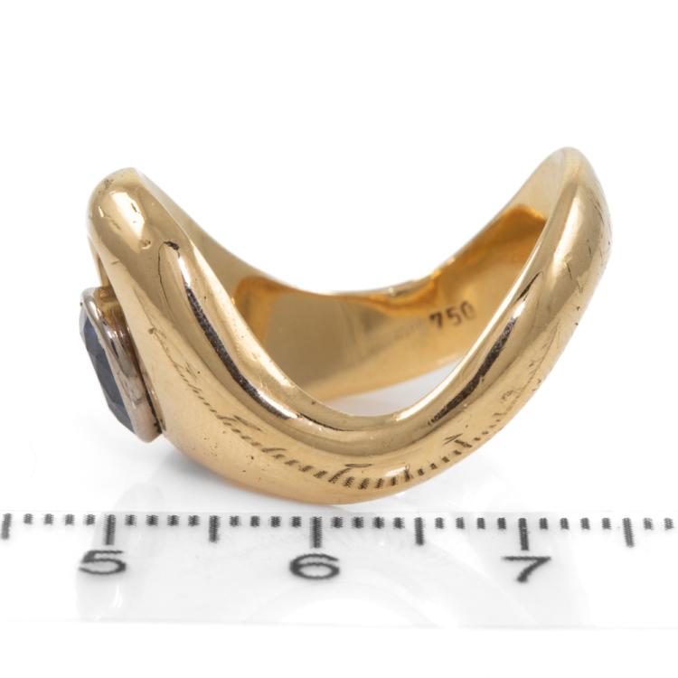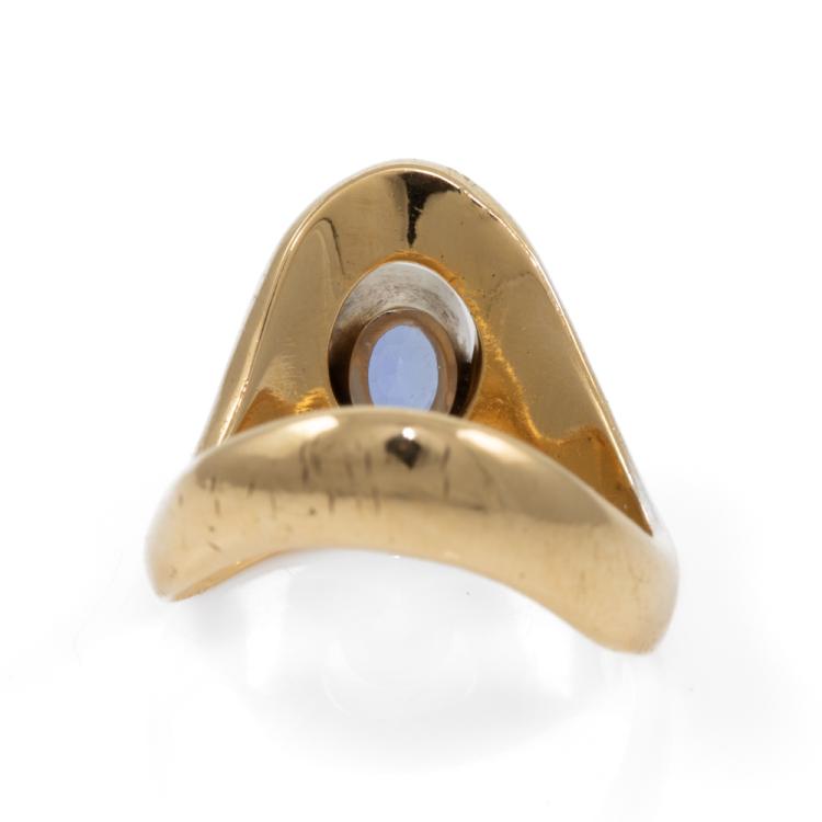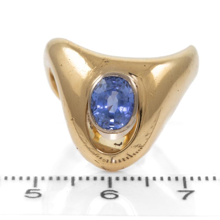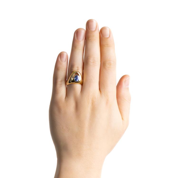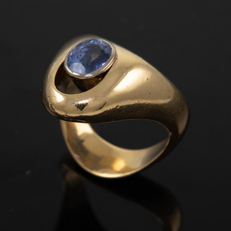 Mens ring with an oval shape blue natural blue Sapphire of approximately 1.50ct. 18ct yellow gold. Ring size R1/2. Band width: 5.8mm-4.0mm. Weight: 16.4g. (Pre-owned)