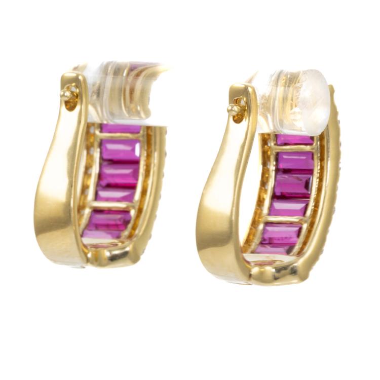Ruby and Diamond earrings with baguette cut Natural Rubies totalling 1.84ct and round Natural Diamonds totalling 0.36ct (Estimated grading: IJ VS-SI). 18ct yellow gold. Weight: 4.7g. (Pre-owned)