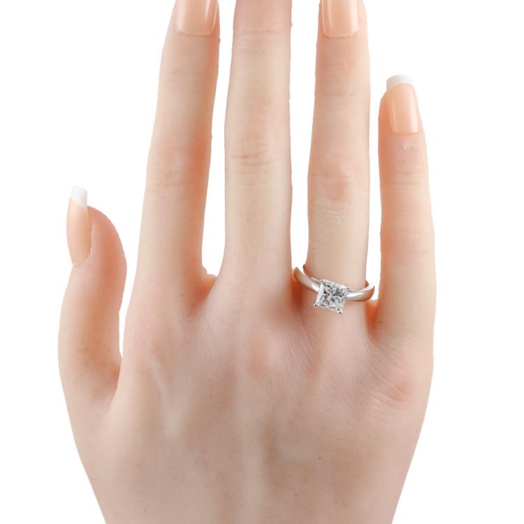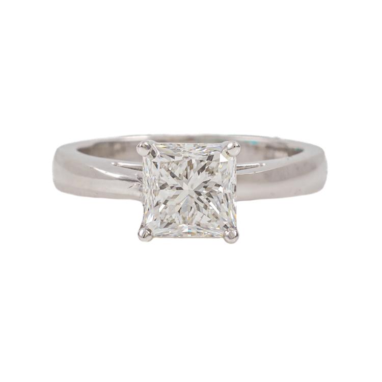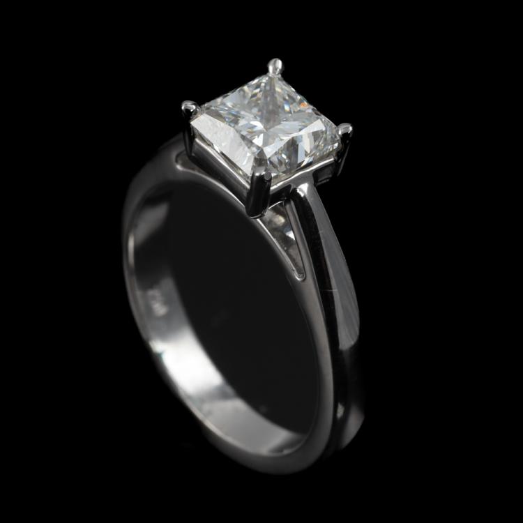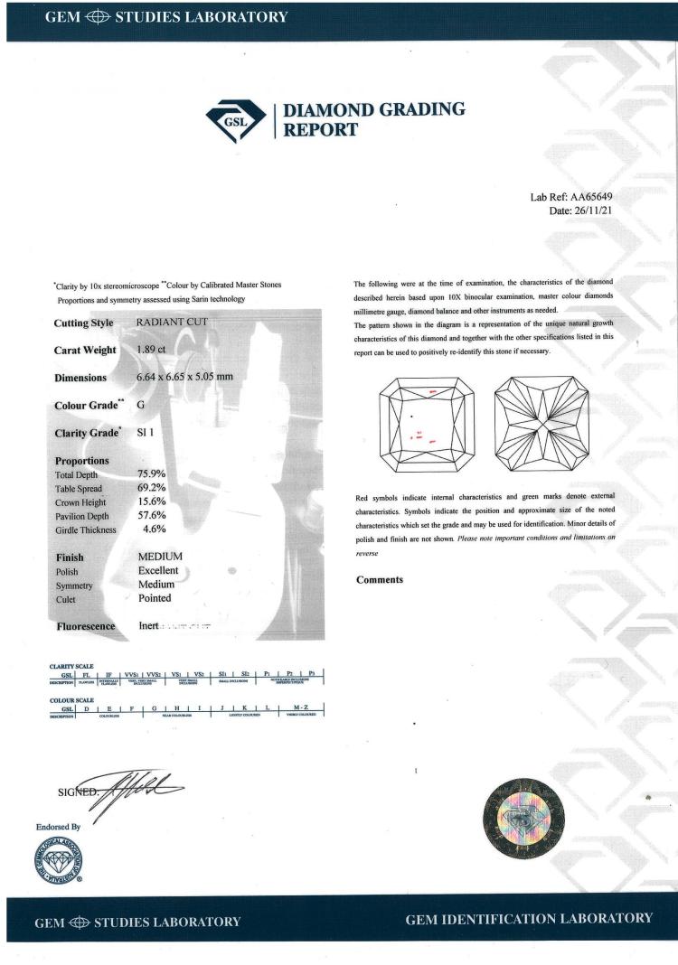 Diamond solitaire ring with radiant cut Natural Diamond of 1.89ct (with GSL Report graded as G SI1 #AA65649). 18ct white gold. Ring size L1/2. Weight: 6.3g (New)