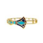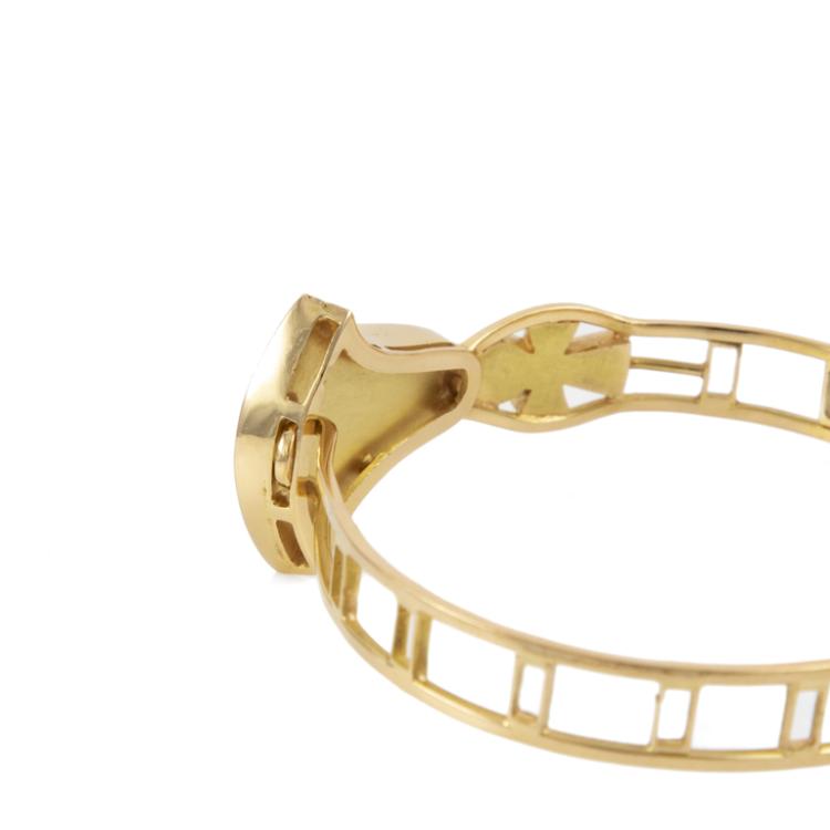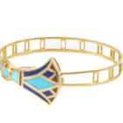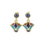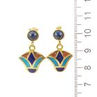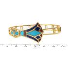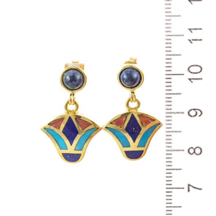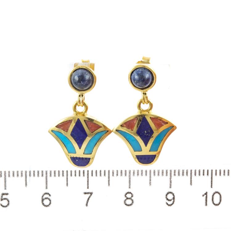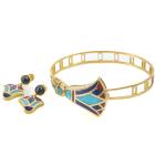 Matching Egyptian style bangle and earring set. 1) Gold Bangle with Turquoise, Lapis Lazuli & Carnelian inlay. 18ct yellow gold with hook closure. Inner circumference: 17cm. Bangle width: 8.3mm. 2) Matching earrings with cabochon cut Lapis Lazuli of 5.1mm and flower drop design of Turquoise, Lapis Lazuli & Carnelian inlay. 18ct yellow gold. Earring drop length: 2.6cm. Total weight: 27.7g. (Pre-owned)