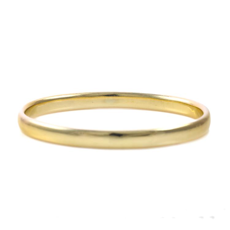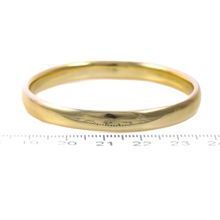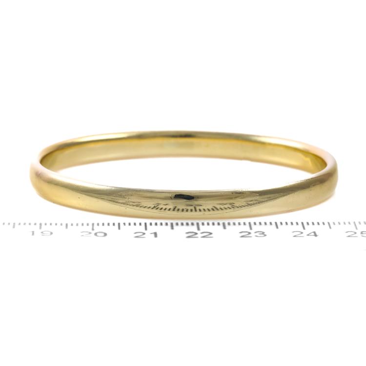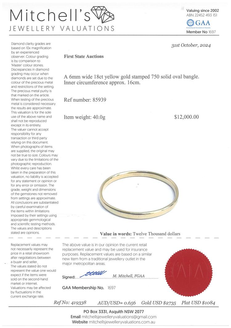 Solid 18ct yellow gold oval shape bangle. Inner circumference: approximately 16cm. Width: 6mm. Weight: 40.0g. With Valuation Certificate #419338. (Pre-owned)
