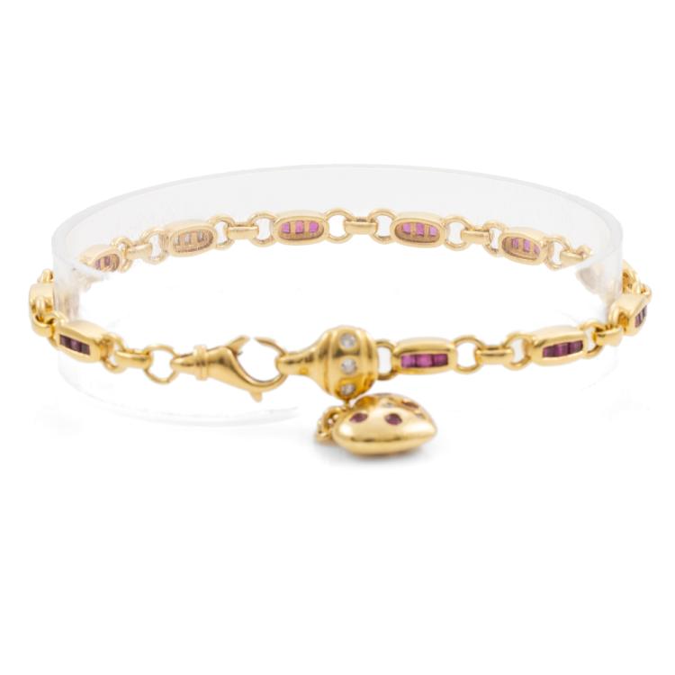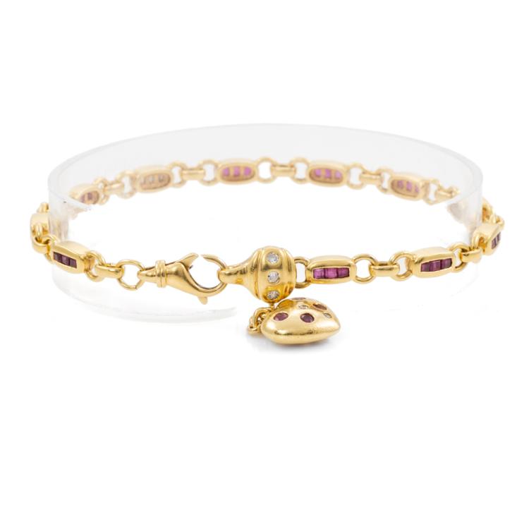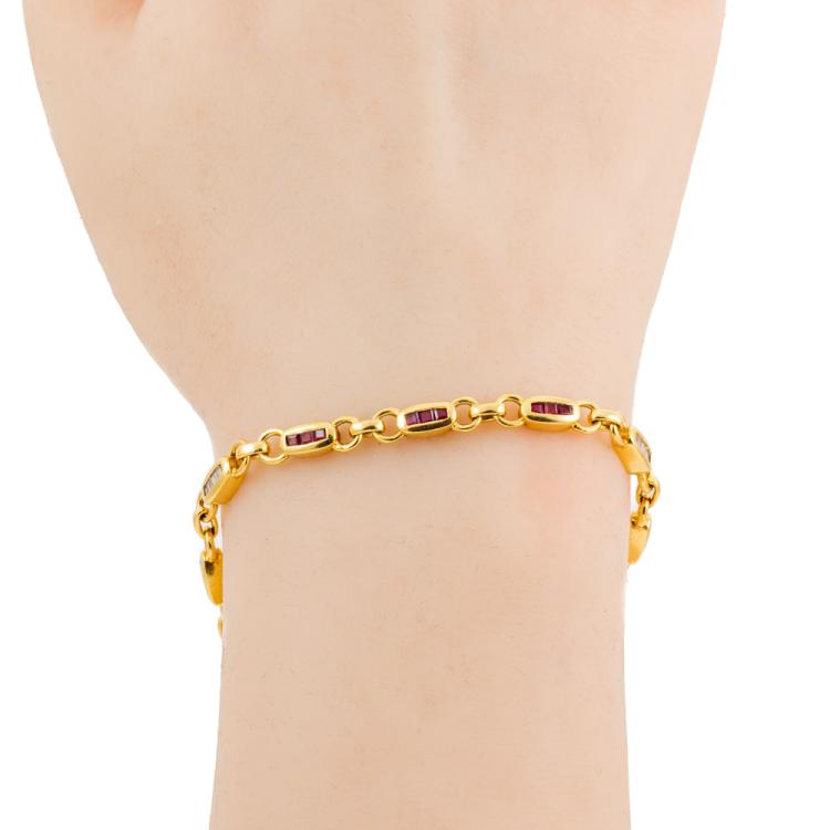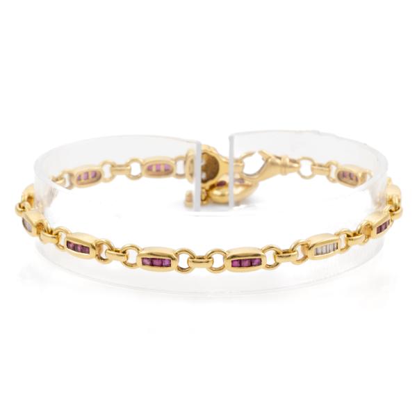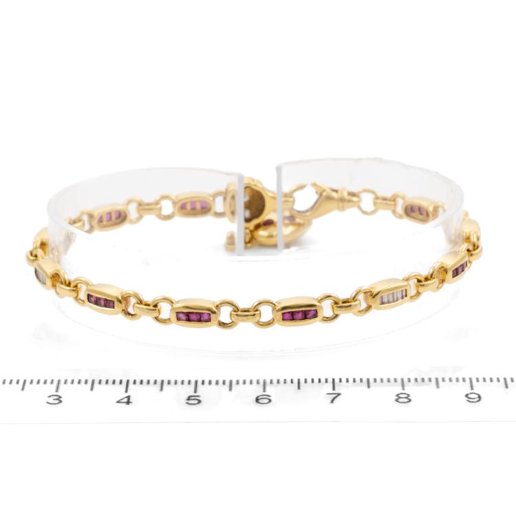 Ruby and Diamond bracelet with care cut natural Rubies totalling approximately 1.95ct and round & baguette cut natural Diamonds totalling approximately 0.20ct. 18ct yellow gold. Length: 21.5cm. Weight: 17.5g. (Pre-owned)