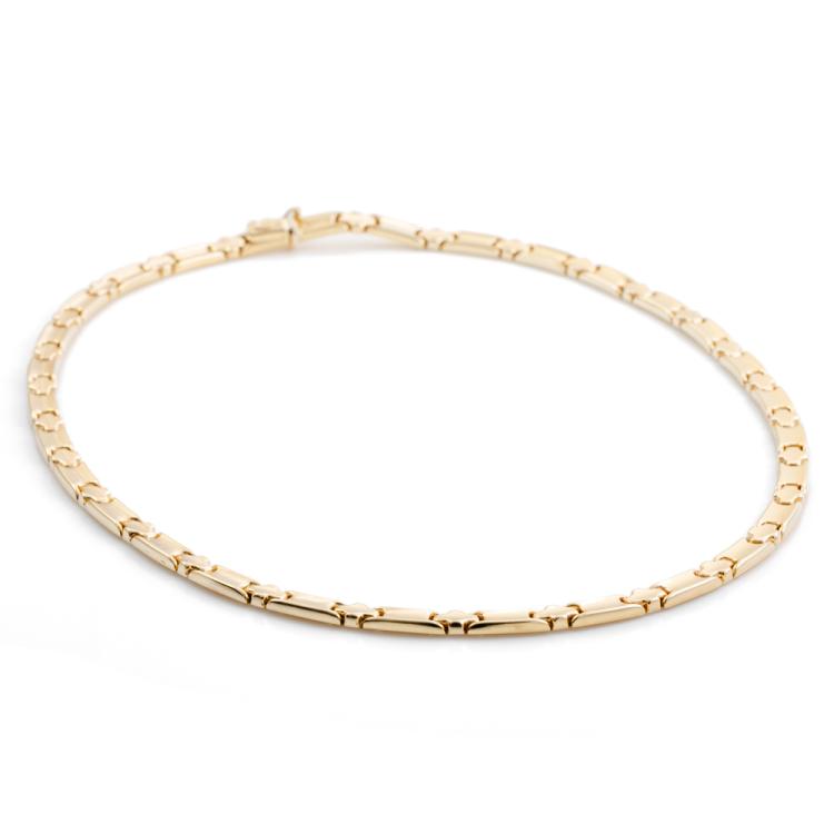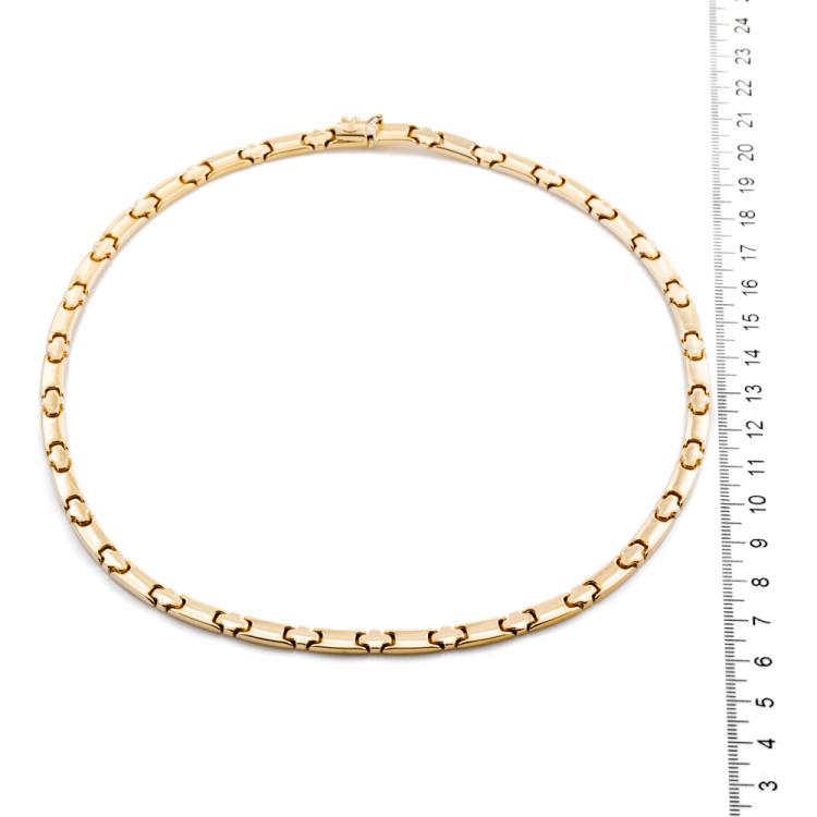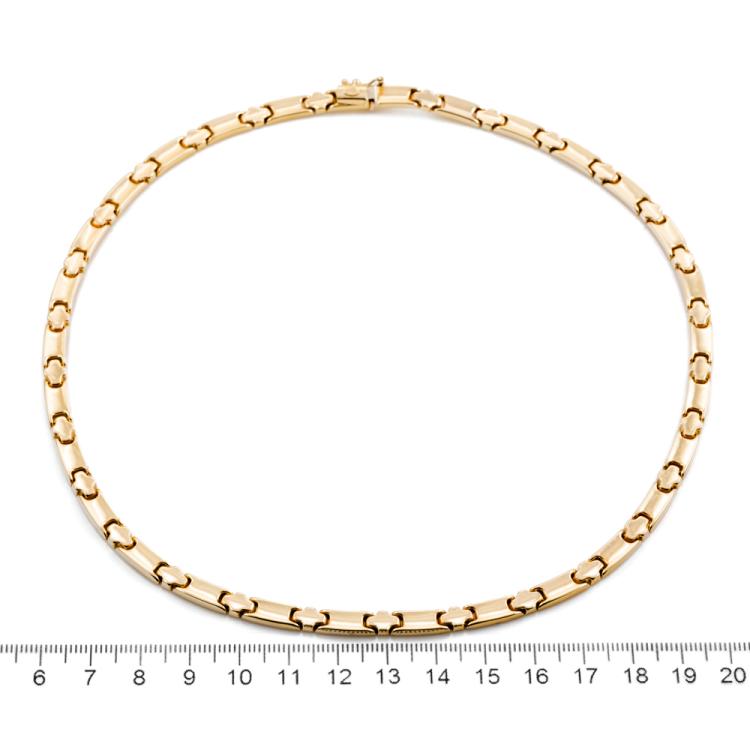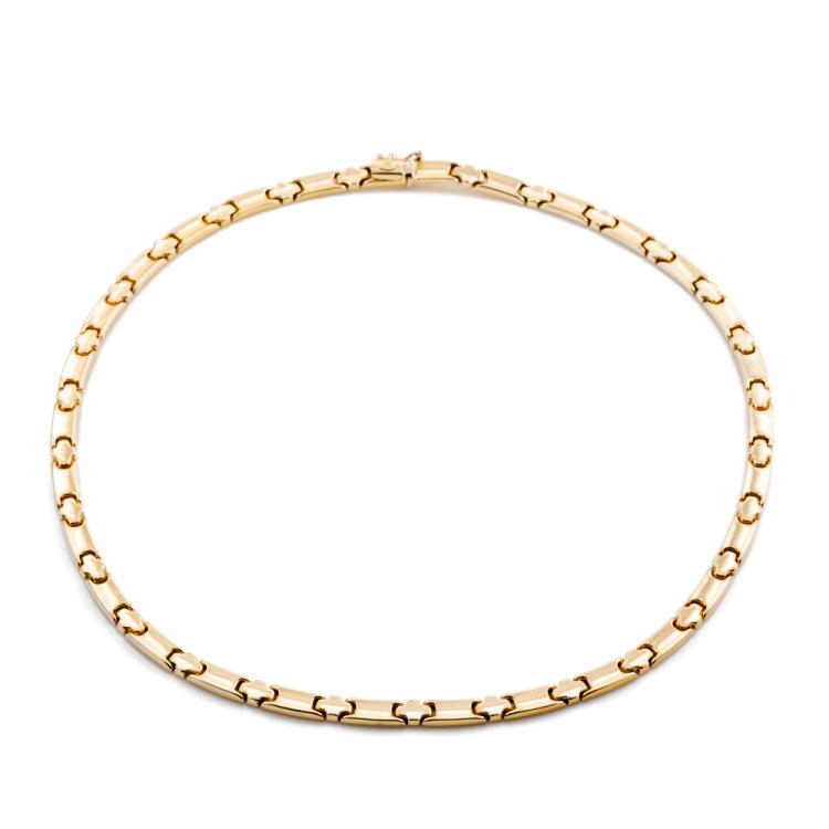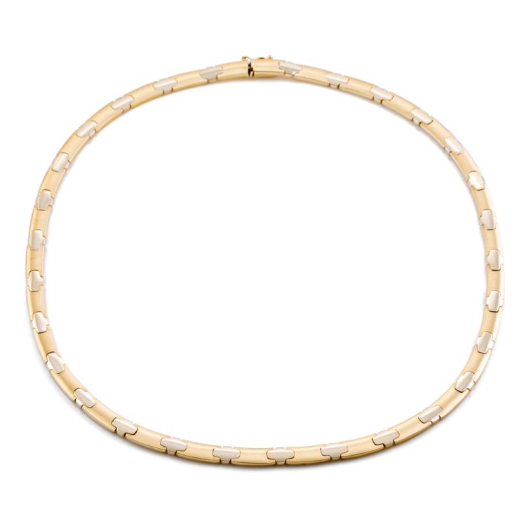 Collar-style gold necklace. 14ct yellow and white gold. Inner circumference: 42cm. Width: 5.2mm. Weight: 22.4g. (Pre-owned)