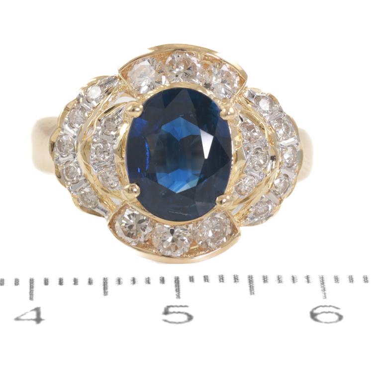 Sapphire and Diamond ring with oval blue Natural Sapphire of 2.02ct with round & baguette cut Natural Diamonds totalling 0.92ct (Estimated grading: I-J SI-P1). 18ct yellow gold. Ring size M. Band width: 3.6mm - 4.1mm. Weight: 7.6g. (As New)