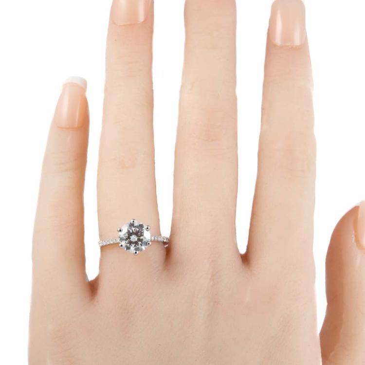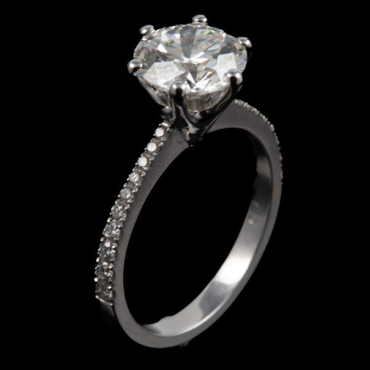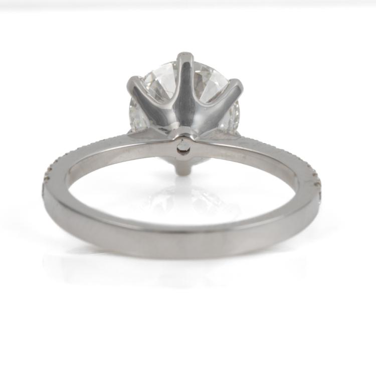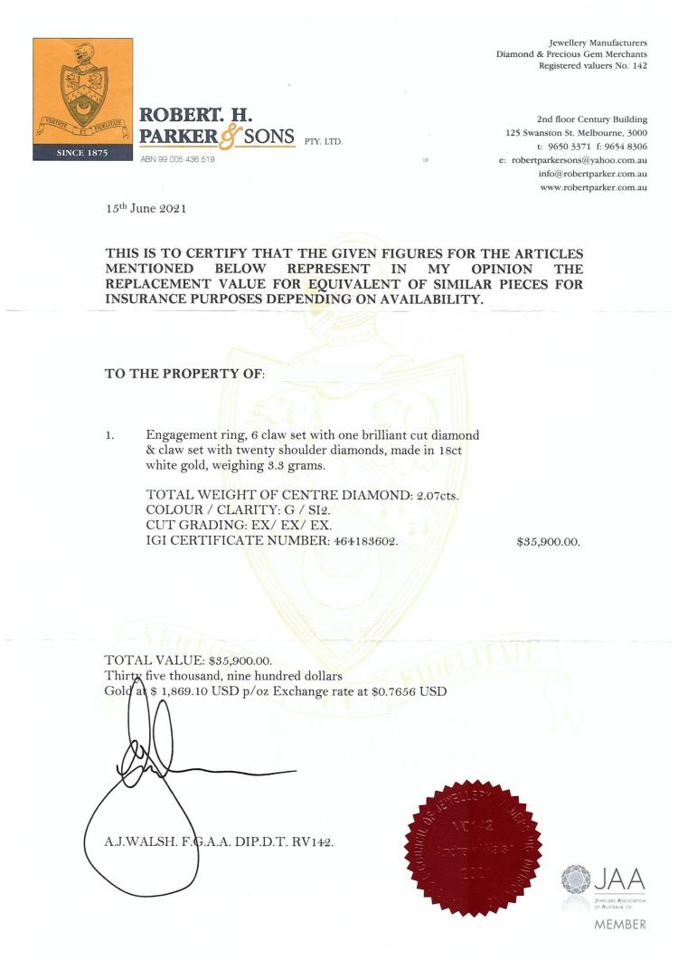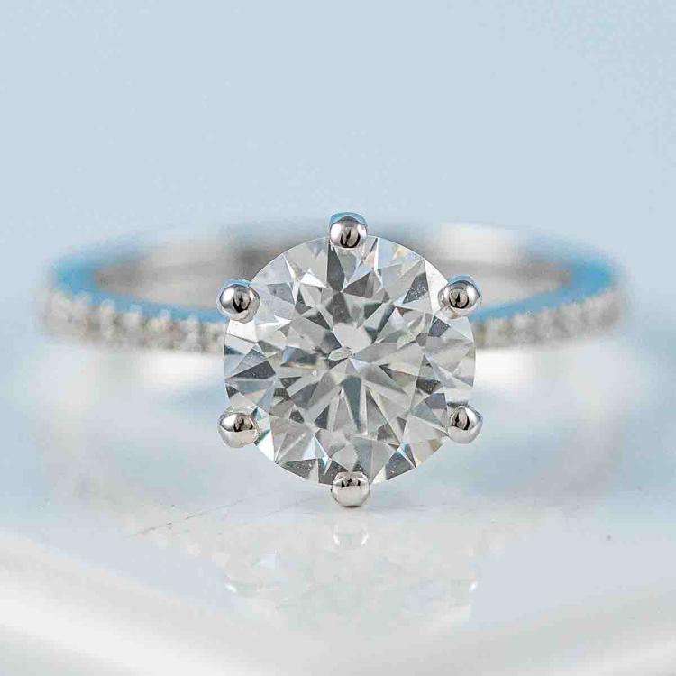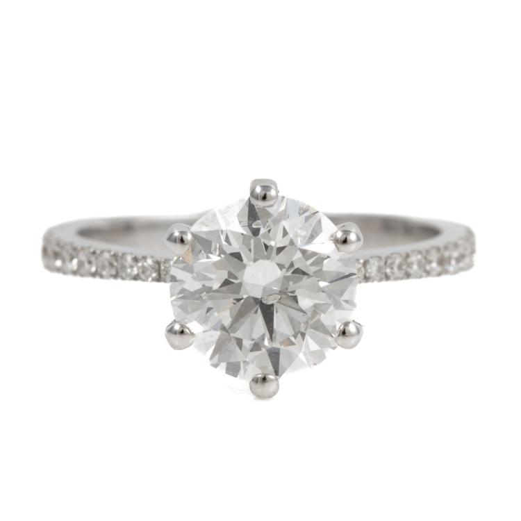 Diamond solitaire ring with a round brilliant cut natural Diamond of 2.07ct (with IGI Report graded as G SI2 #464183602) and shoulder round Diamonds totalling approximately 0.20ct. 18ct white gold. Ring size K. Band width: 2.2mm - 1.2mm. Weight: 3.3g. With Valuation Certificate dated 15/06/2021. (Pre-owned)