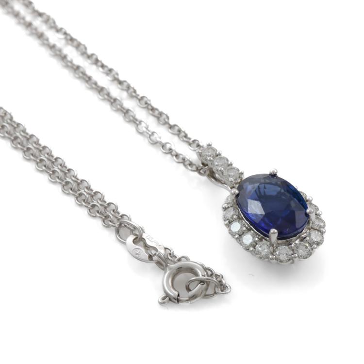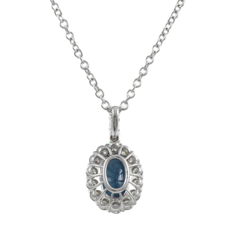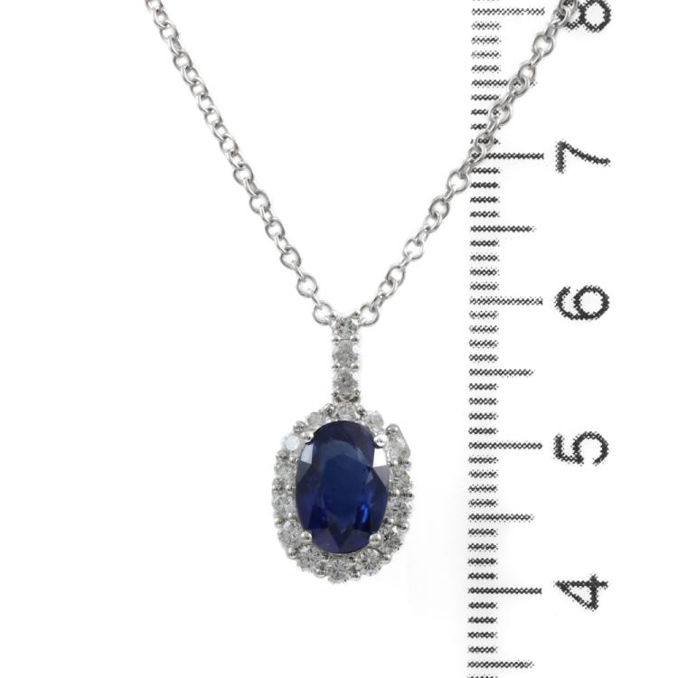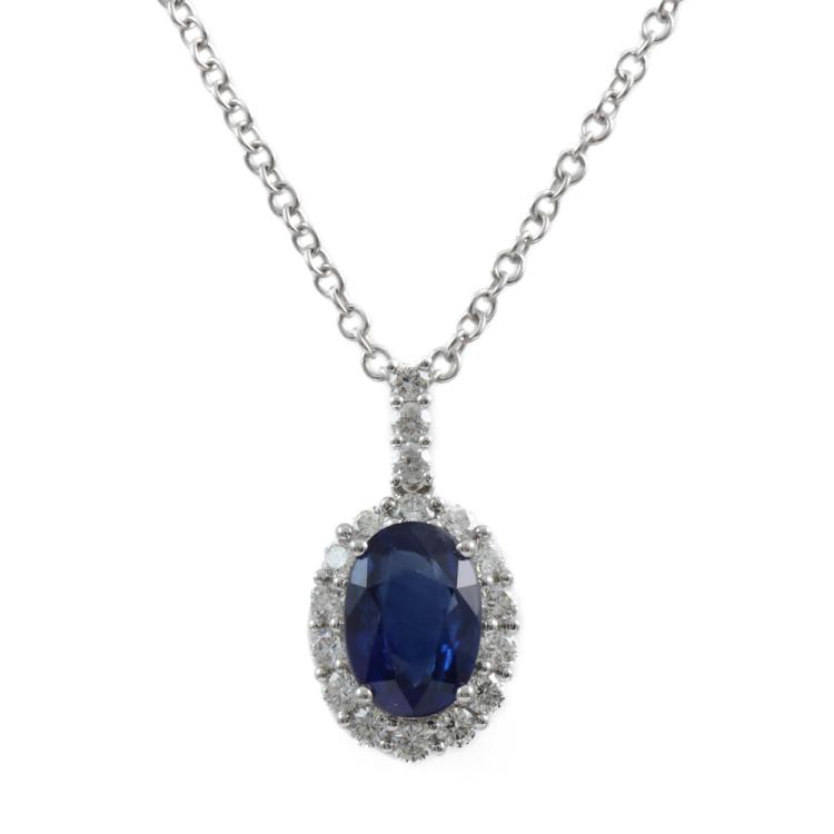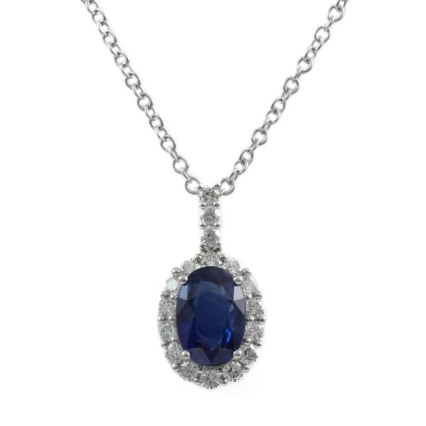Sapphire and Diamond pendant with centre oval blue Natural Sapphire totalling 2.08ct and round Natural Diamonds totalling 0.47ct (Estimated grading: H-I SI). 18ct white gold with 45.5cm 18ct white gold chain. Weight: 4.4g. (Pre-owned)