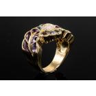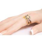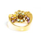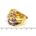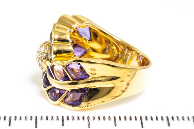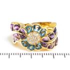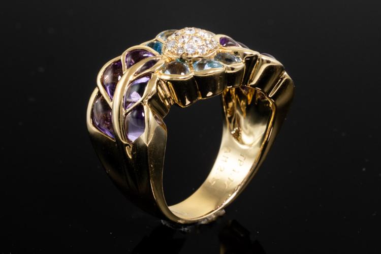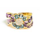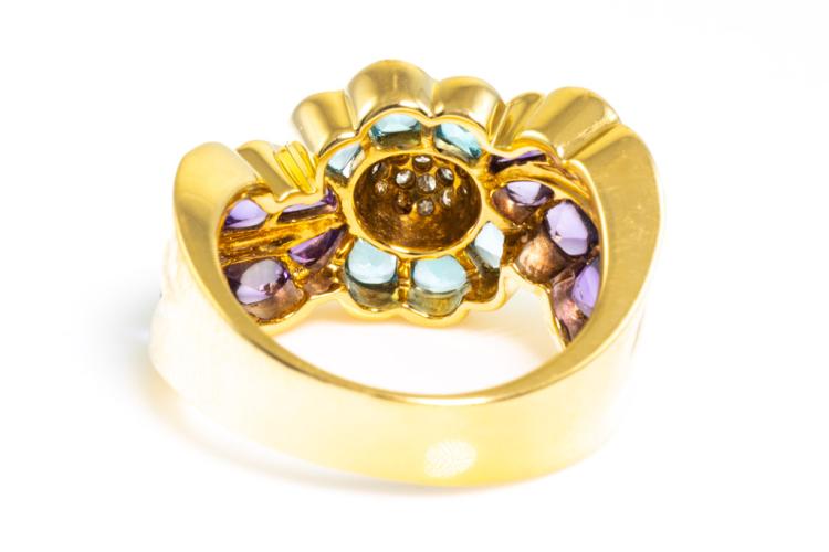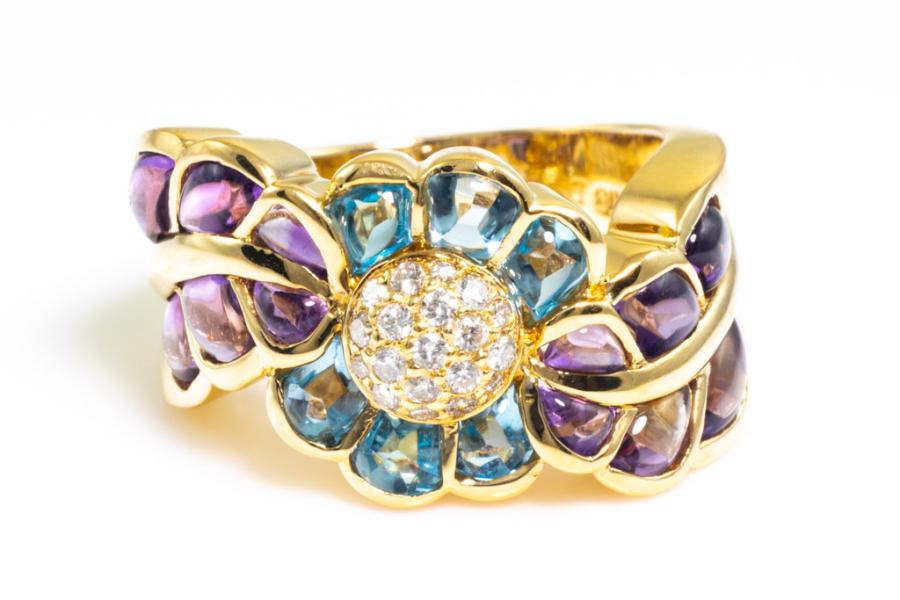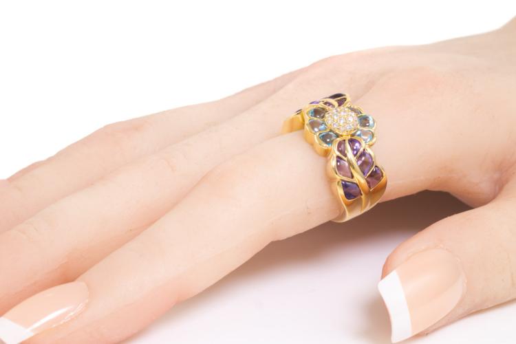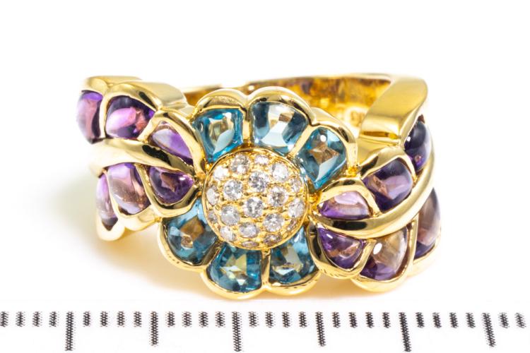 Amethyst, Topaz and Diamond ring with fancy cut Amethysts totalling 2.17ct, fancy cut blue Topaz totalling 1.17ct and round Diamonds totalling 0.16ct. 18ct yellow gold. Ring size L - ring resizing is not recommended. Weight: 9.8g. (Pre-owned)