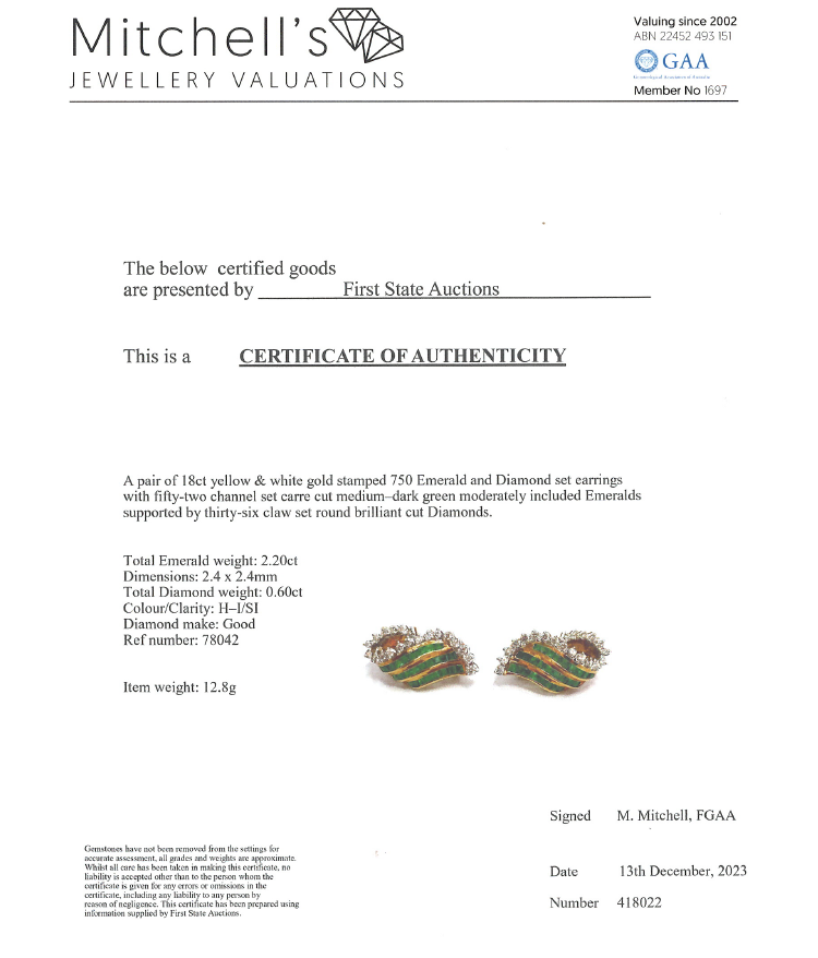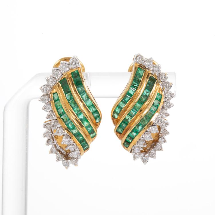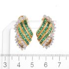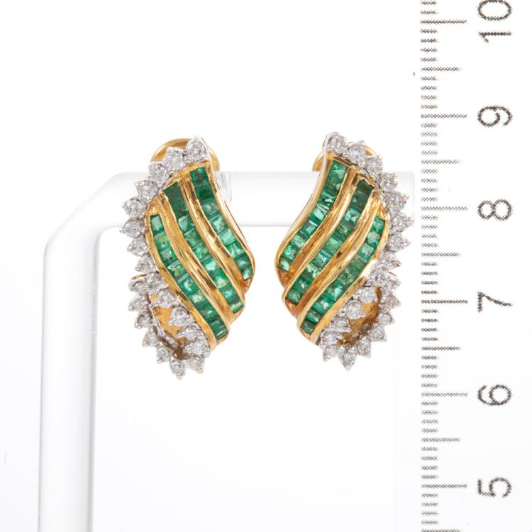 Emerald & Diamond clipped on earrings with carre cut Natural Emeralds totalling 2.20ct and round Natural Diamonds totalling 0.60ct (Estimated grading: H-I SI). 18ct yellow gold. Weight: 12.8g. With Certificate #418022. (Pre-owned)