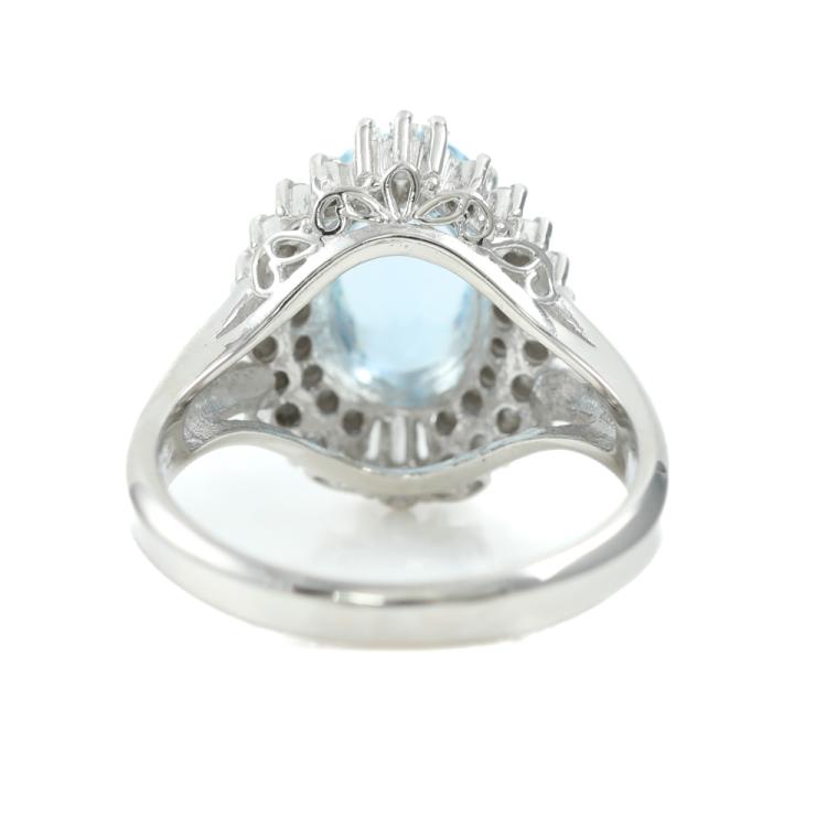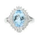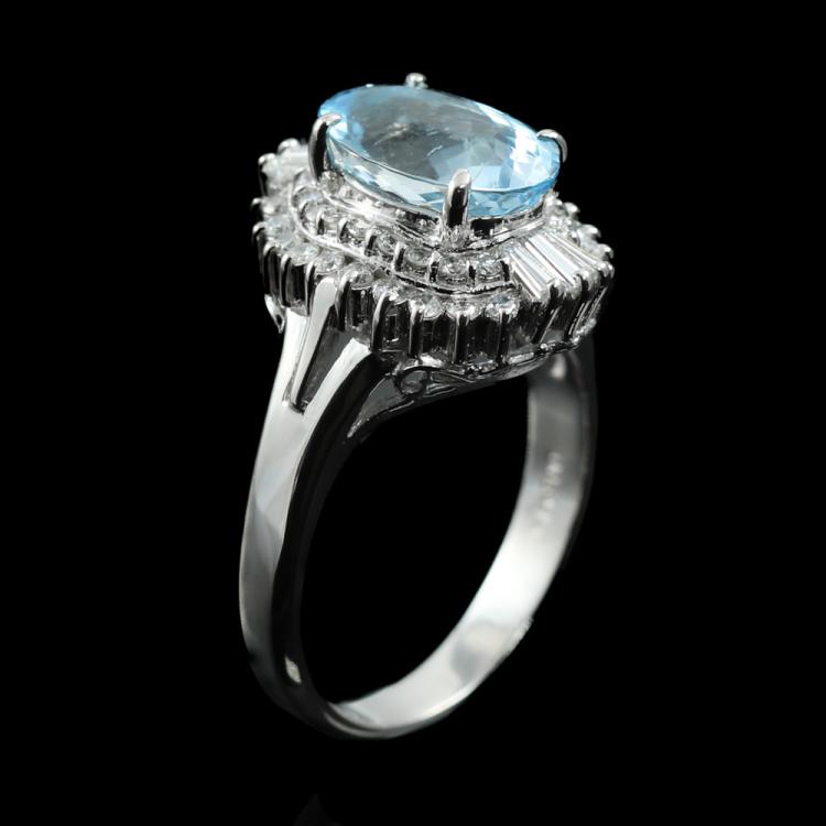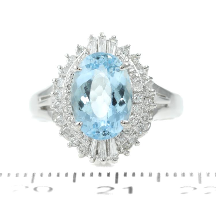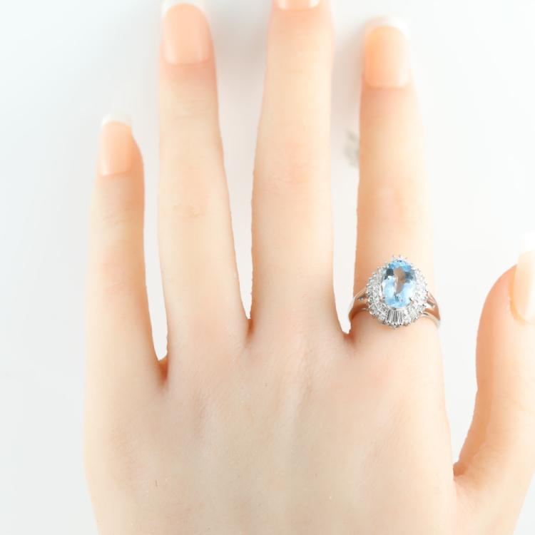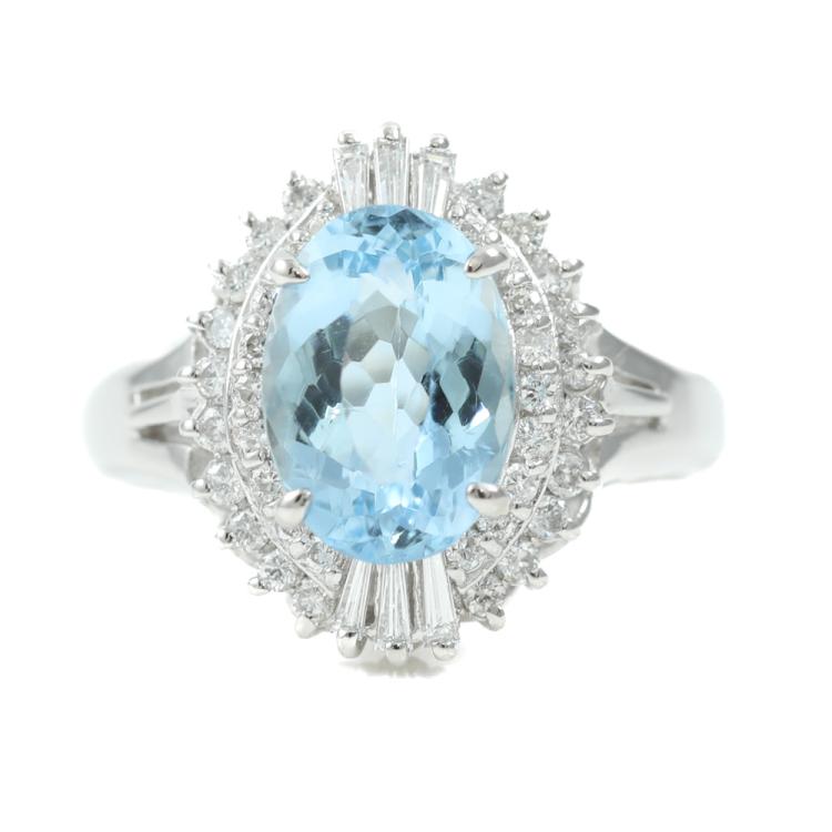 Aquamarine and Diamond ring with oval shape Natural Aquamarine of 2.25ct and round & baguette cut natural Diamonds totalling 0.46ct (Estimated grading: G-H VS-SI). Platinum-900. Ring size: L3/4. Band width: 2.7mm-3.8mm. Weight: 9.1g. (As New)