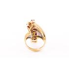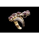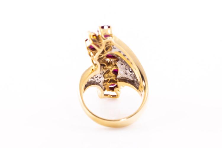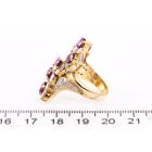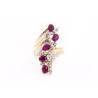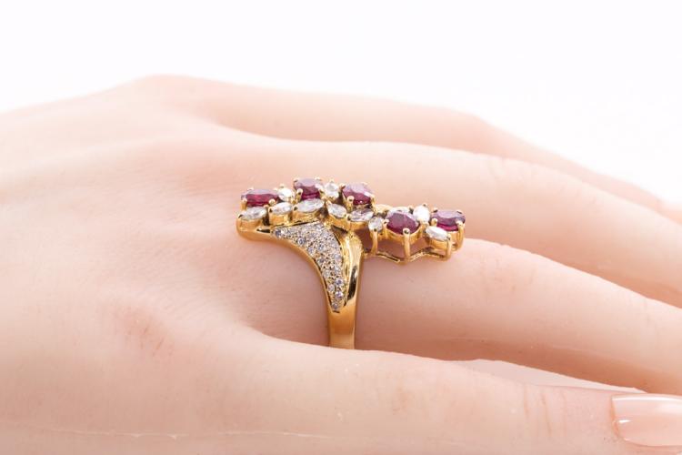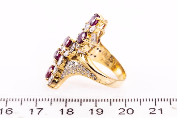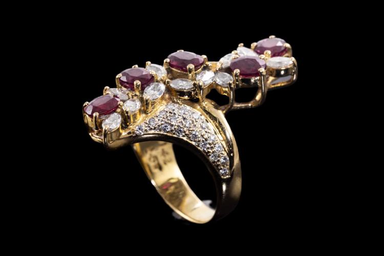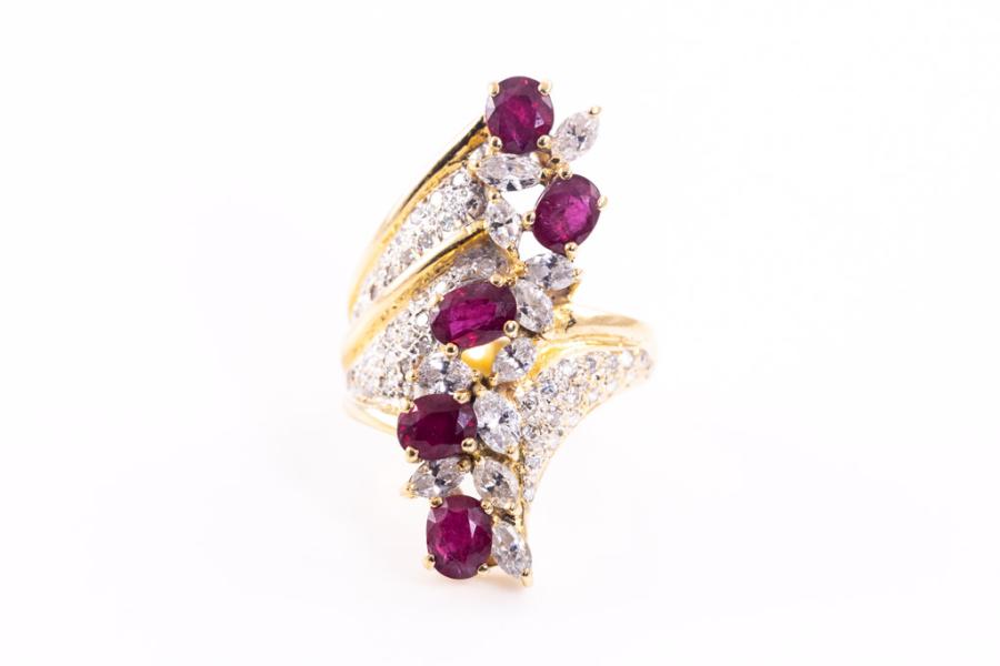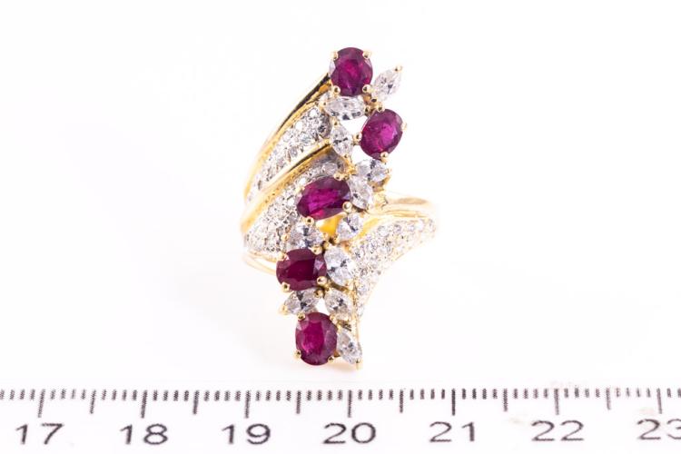 Ruby and Diamond ring with oval shape Natural Rubies totalling 2.59ct and round & marquise cut Natural Diamonds totalling 1.42ct (Estimated grading: H-I SI). 18ct yellow gold. Ring size L1/2. Weight: 10.9g. (Pre-owned)