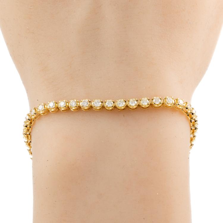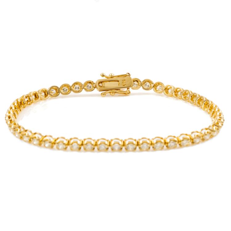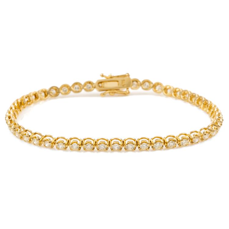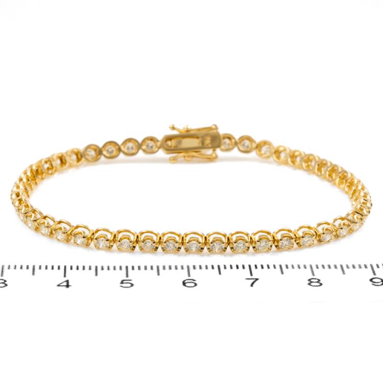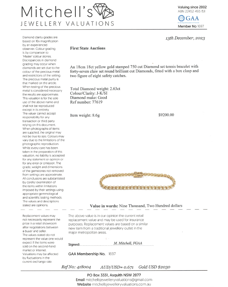 Diamond tennis bracelet with 47 round brilliant cut Natural Diamonds totalling 2.63cts. (Estimated grading: J-K SI). 18ct yellow gold. Length: 18cm. Weight: 8.6g. With Valuation Certificate #418004. (New)