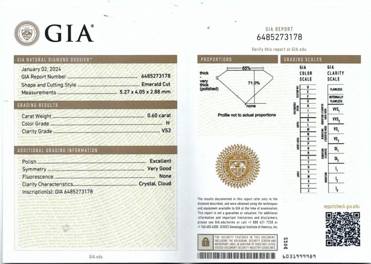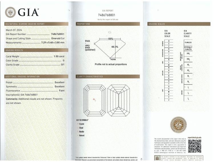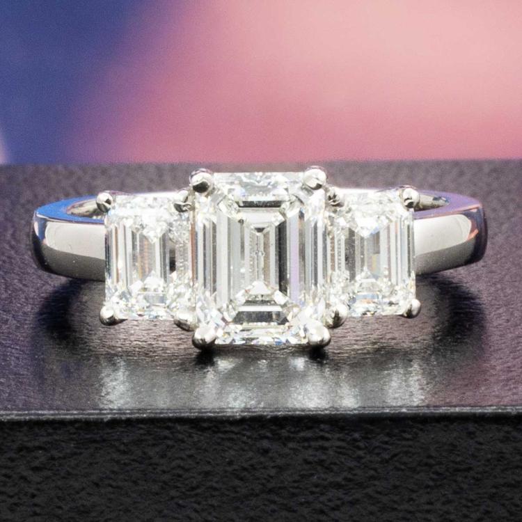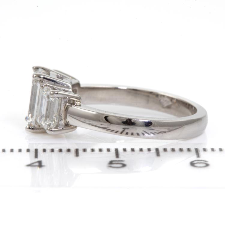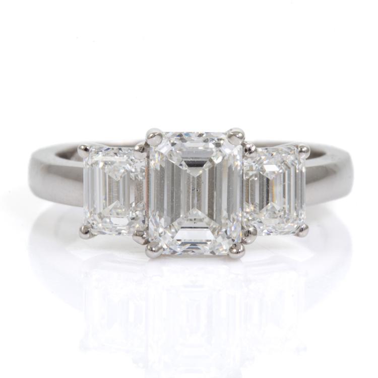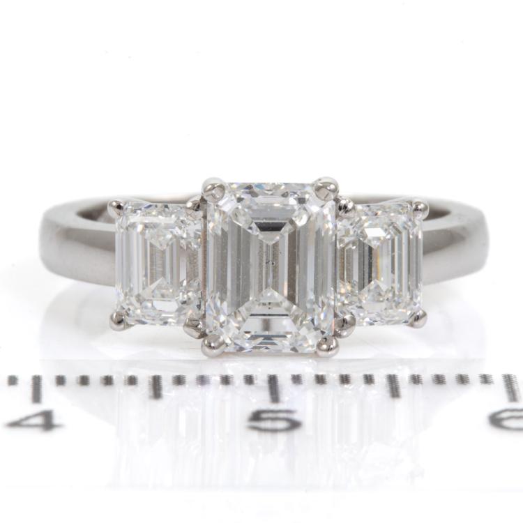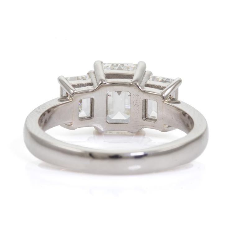 Diamond trilogy ring with centre emerald cut Natural Diamond of 1.50cts (with GIA Report graded as G SI1 # 7486768801) and 2 side emerald cut Natural Diamonds totalling 1.20cts (with GIA Summary Reports graded as G VS2 #1489621735 and H VS2 #6485273178) Platinum. Ring size L. Band width: 2.6mm - 2.7mm. Weight: 6.6g. (New))