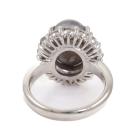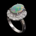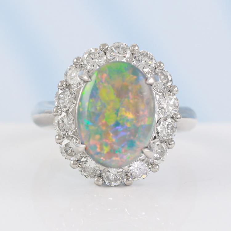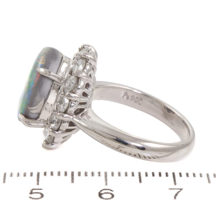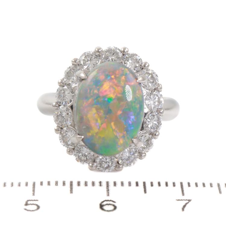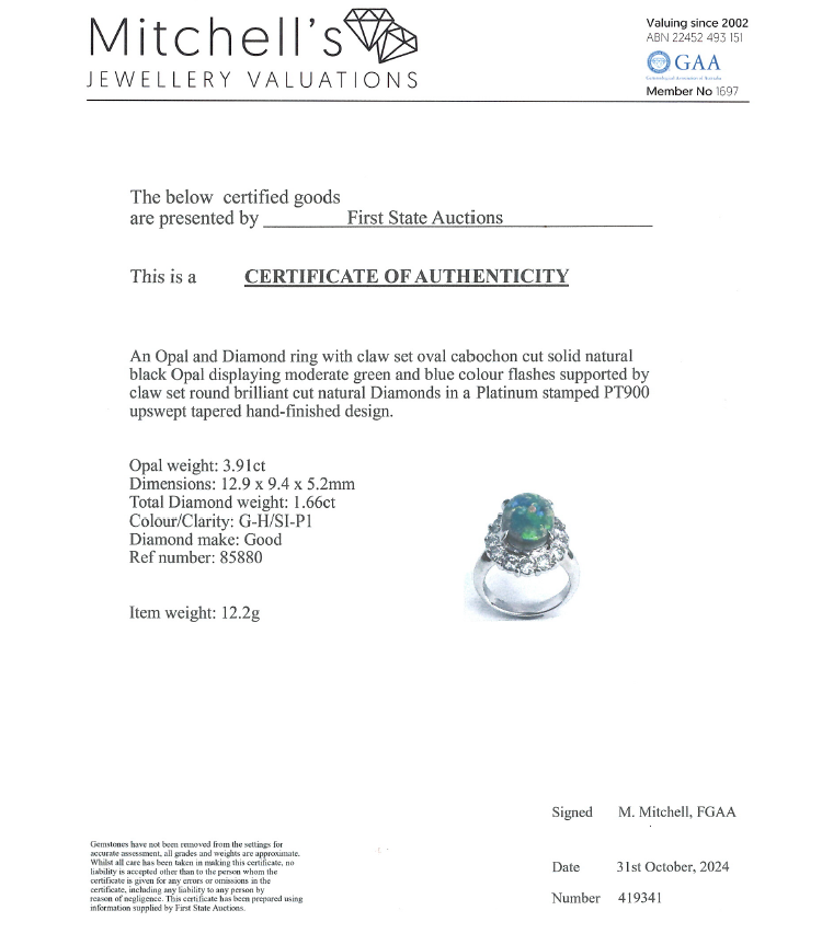 Opal and Diamond ring with solid Natural Black Opal of 3.91ct and round Natural Diamonds totalling 1.66ct (Estimated grading: G-H SI-P1). Platinum-900. Ring size L. Band width: 3.1mm - 2.9mm. Weight: 12.2g. With Certificate #419341. (Pre-owned)