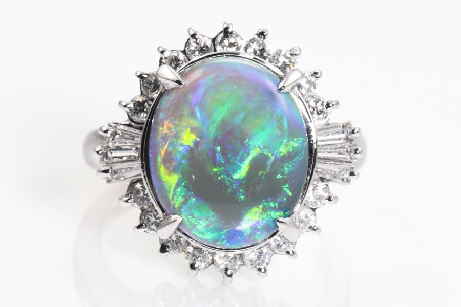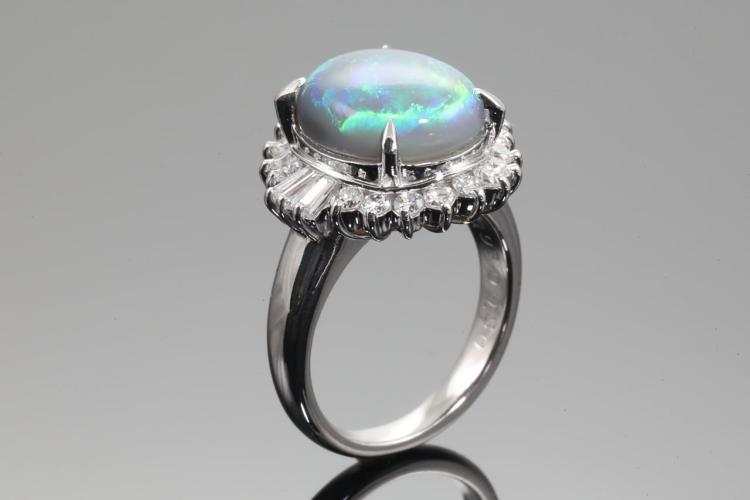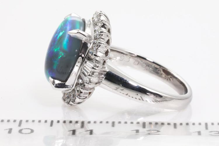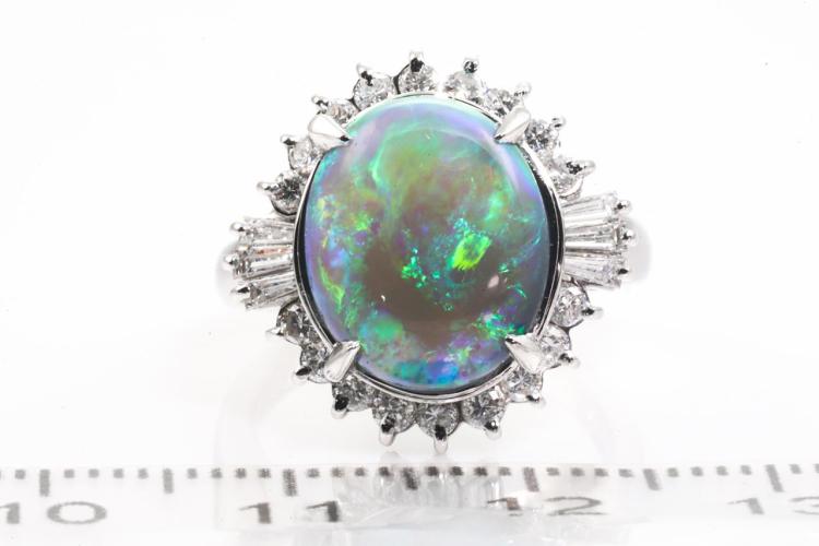 Opal and Diamond Ring with an oval cabochon cut solid grey Natural Opal of 3.93ct and round & baguette cut natural Diamonds totalling 0.80ct (Estimated grading: G SI). Platinum-900. Ring size I. Weight: 9.0g (Pre-owned)