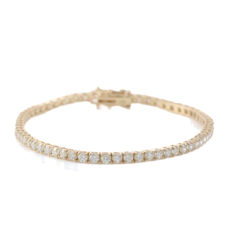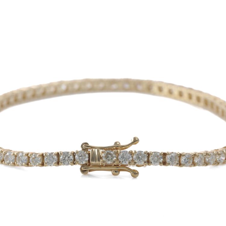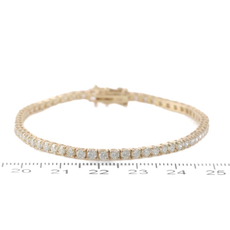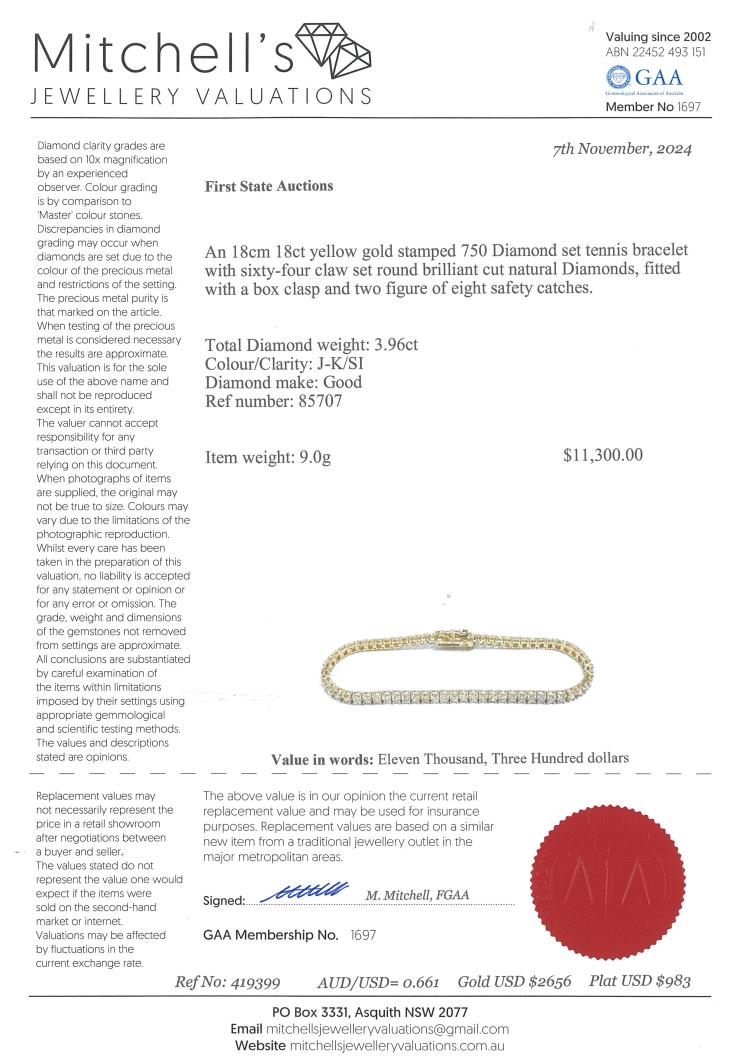 Diamond tennis bracelet with 64 round diamonds totalling 3.96ct (Estimated grading: J-K SI). 18ct yellow gold. Length: 18cm. Weight: 9.0g. With Valuation Certificate #419399. (New)