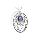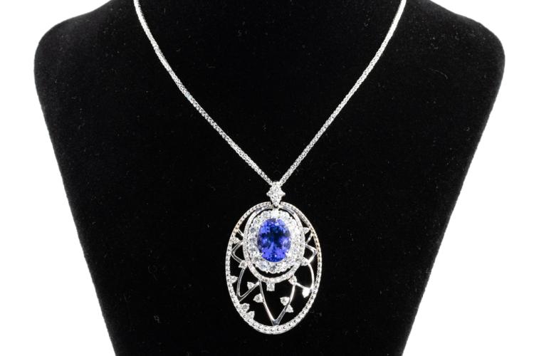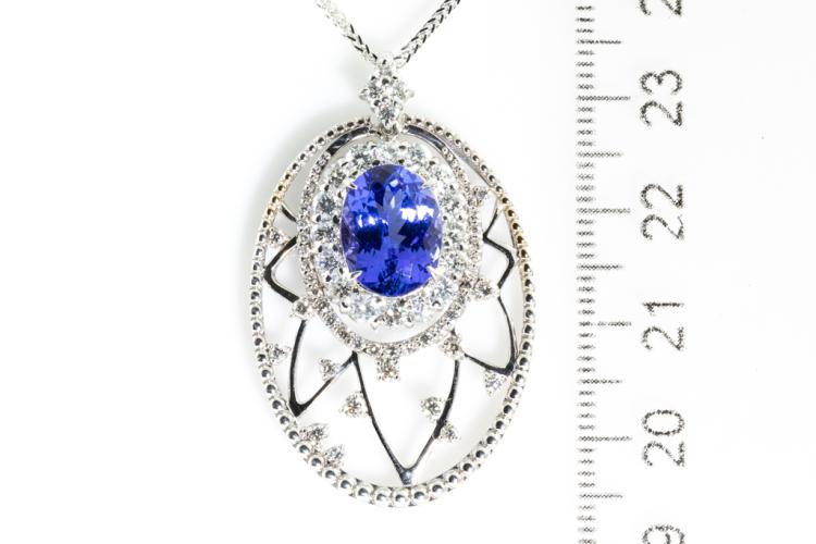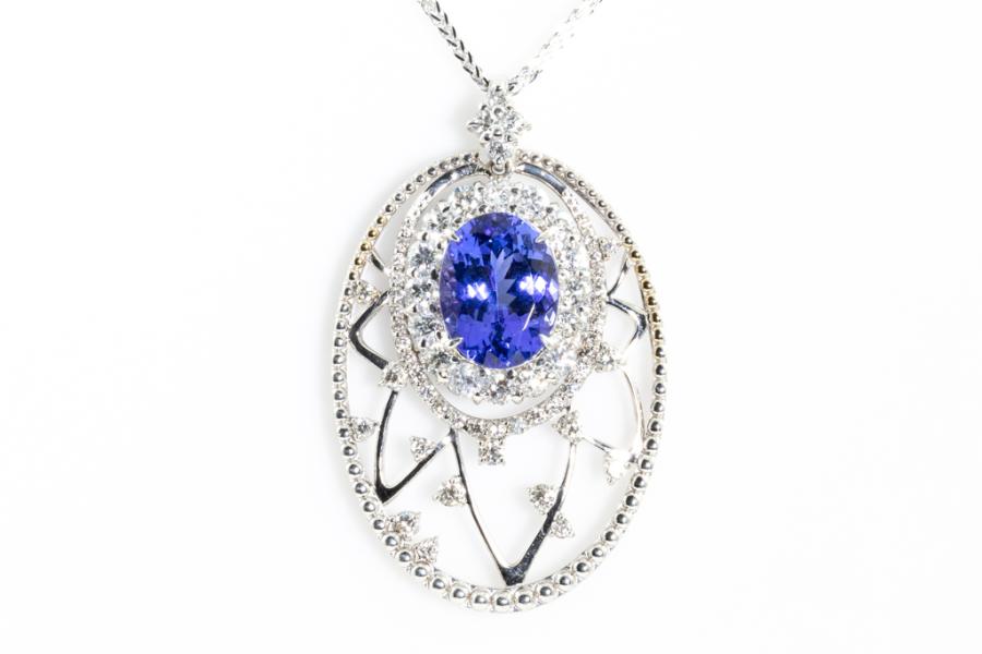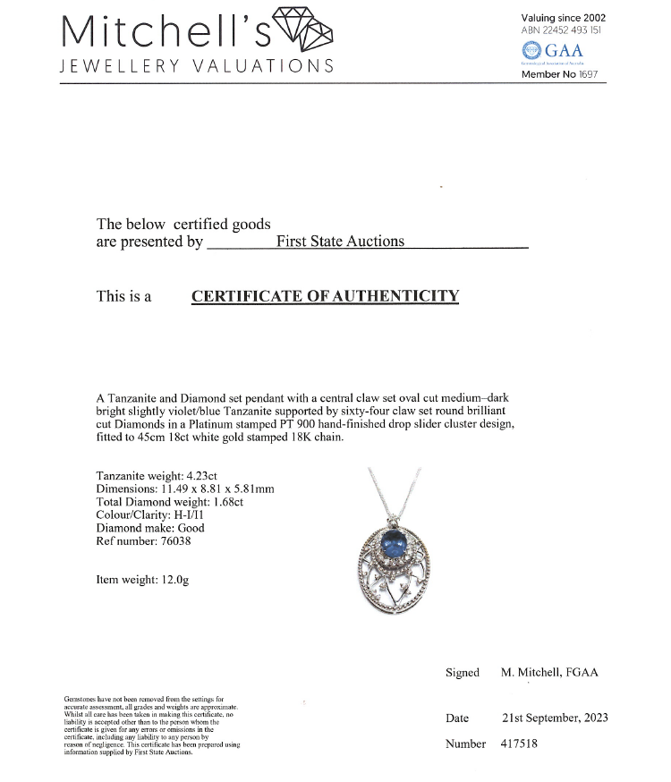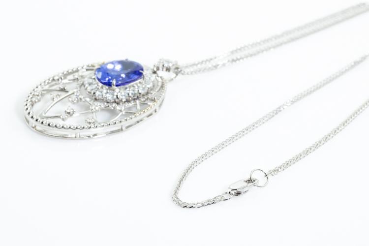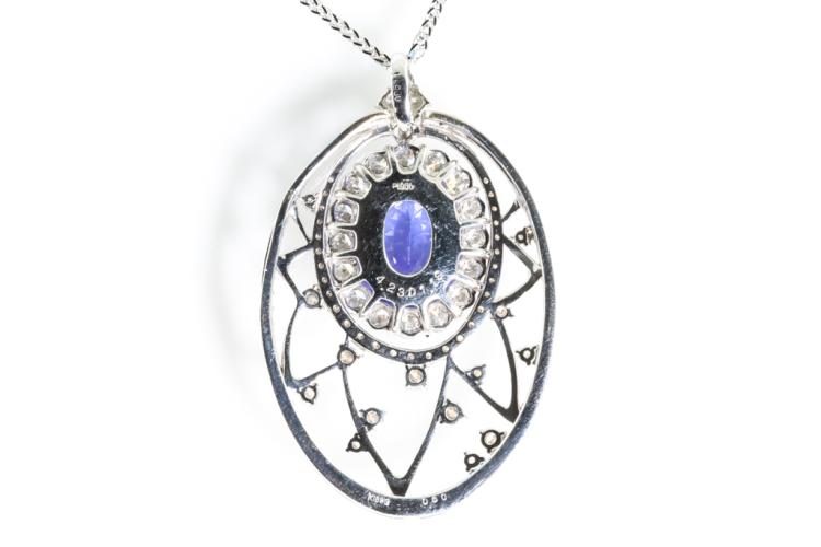 Tanzanite and Diamond pendant with oval shape Natural Tanzanite of 4.23ct and round Natural Diamonds totalling 1.68ct (Estimated grading: H-I P1). Platinum 900 with 18ct white gold 45cm chain. Weight: 12.0g. With Certificate #417518. (Pre-owned)