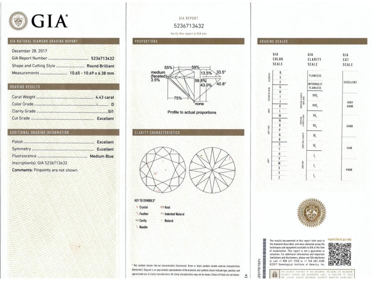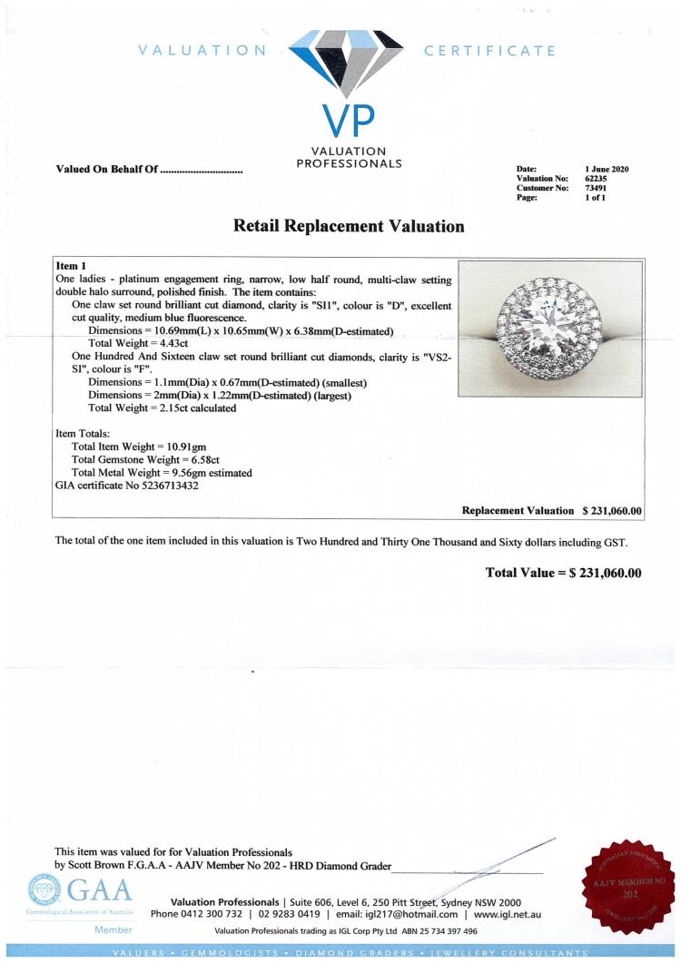 Diamond double halo ring with a centre round brilliant cut Diamond of 4.43ct (With GIA Report graded as D SI1 #5236713432) and remaining round Natural Diamonds totalling 2.15ct (Estimated grading: F VS2-SI). Platinum. Ring size J. Band width: 2.10mm - 2.25mm. Weight: 10.2g. With Valuation Certificate #62235. (New)