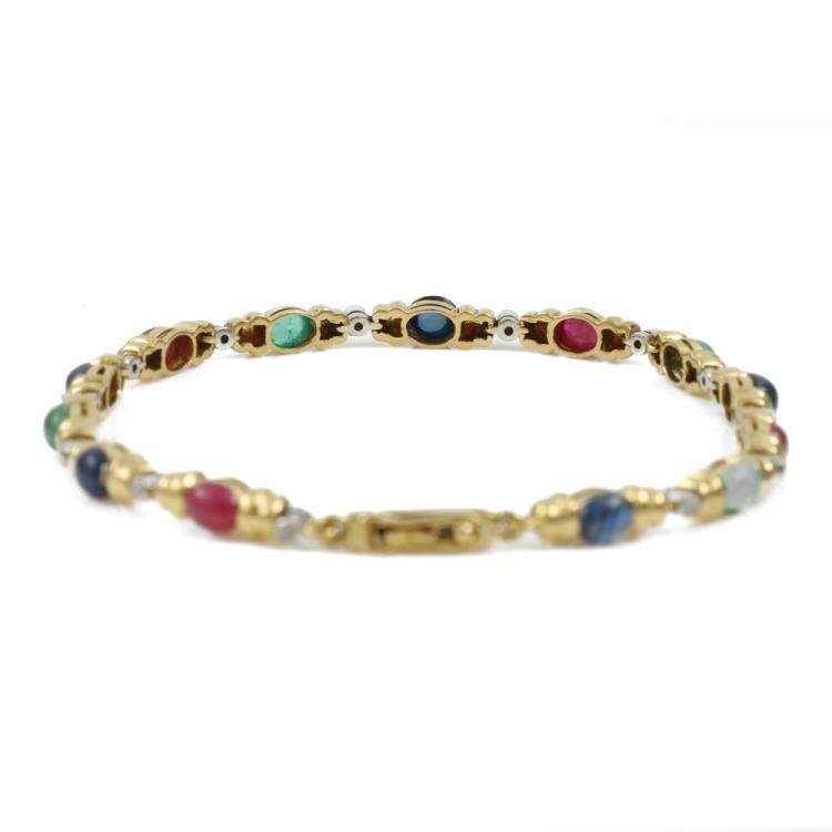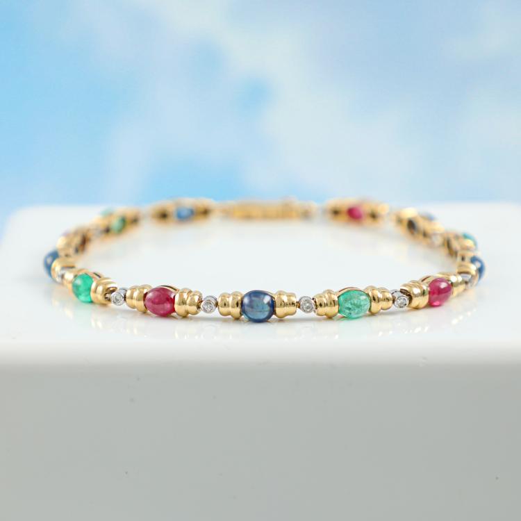 Mixed Gemstones and Diamond bracelet with oval cabochon cut Natural Gemstones totalling 4.73ct (including Natural Rubies totalling 1.40ct, Natural Emeralds totalling 1.03ct and Natural blue Sapphires totalling 2.33ct) and round Natural Diamonds totalling approximately 0.13ct. 18ct yellow gold. Length: 18cm. Weight 11.3g. (Pre-Owned)