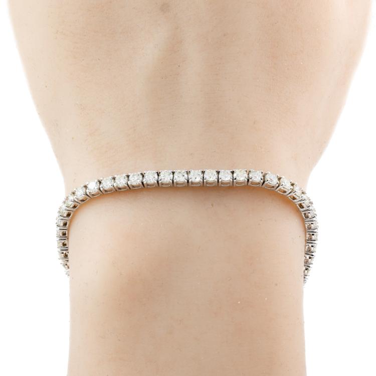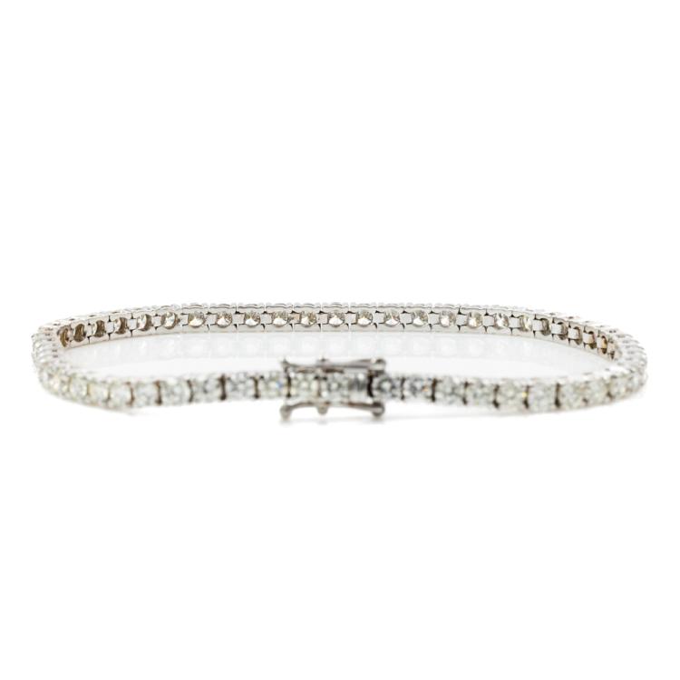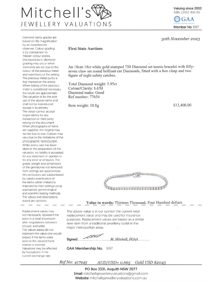 Diamond tennis bracelet with 57 round brilliant cut Natural Diamonds totalling 5.95ct. (Estimated grading: I-J SI). 18ct white gold. Length: 18cm. Weight: 10.8g. With Valuation Certificate #417945. (New)