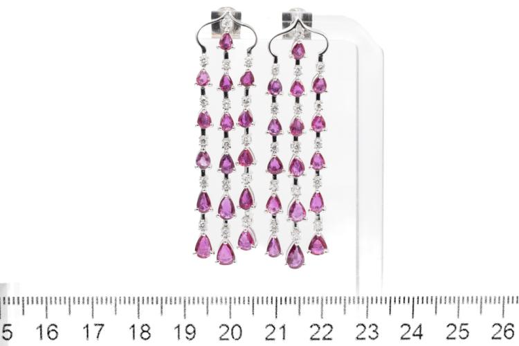 Ruby and Diamond earrings with Ruby totalling 6.48ct and Diamonds totalling 0.68ct (Estimated grading: H SI). 18ct white gold. Weight: 16.5g. With certificate#417679 . (Pre-owned)