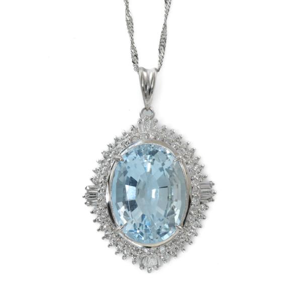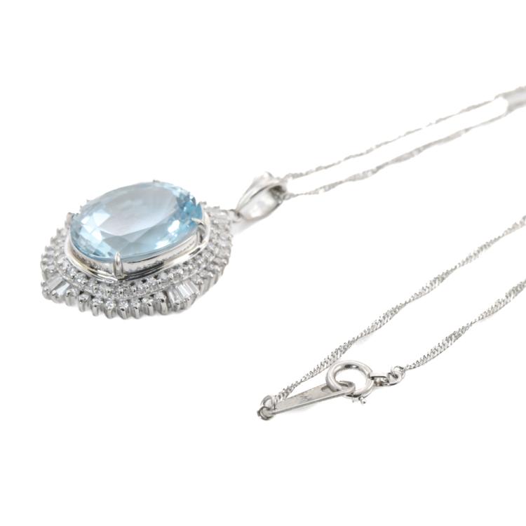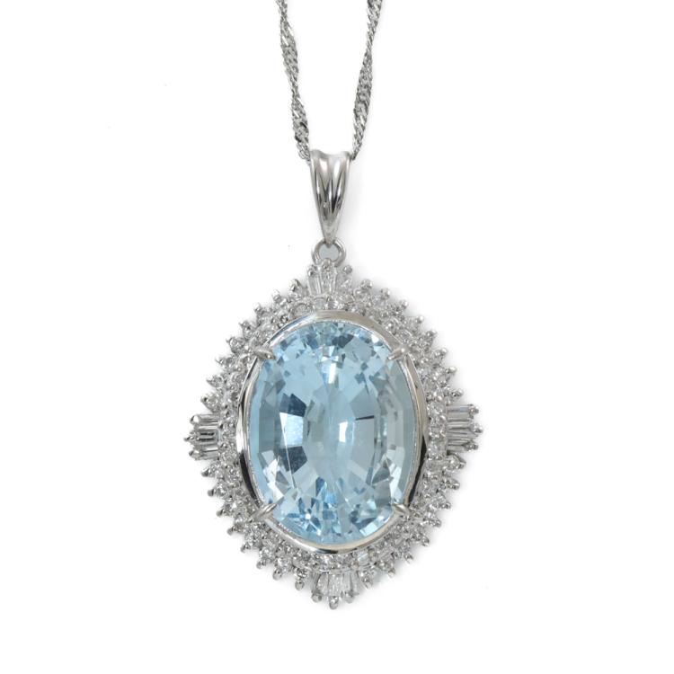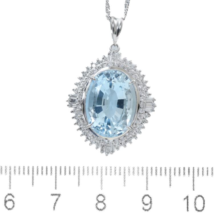 Aquamarine and Diamond pendant with oval shape Natural Aquamarine of 6.89ct and round & baguette cut Natural Diamonds totalling 0.70ct (Estimated grading: G-H VS-SI). Platinum - 900 with 40cm Platinum - 850 chain. Weight: 9.1g. (Pre-owned)