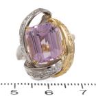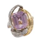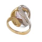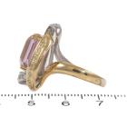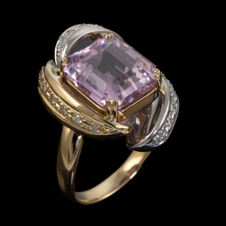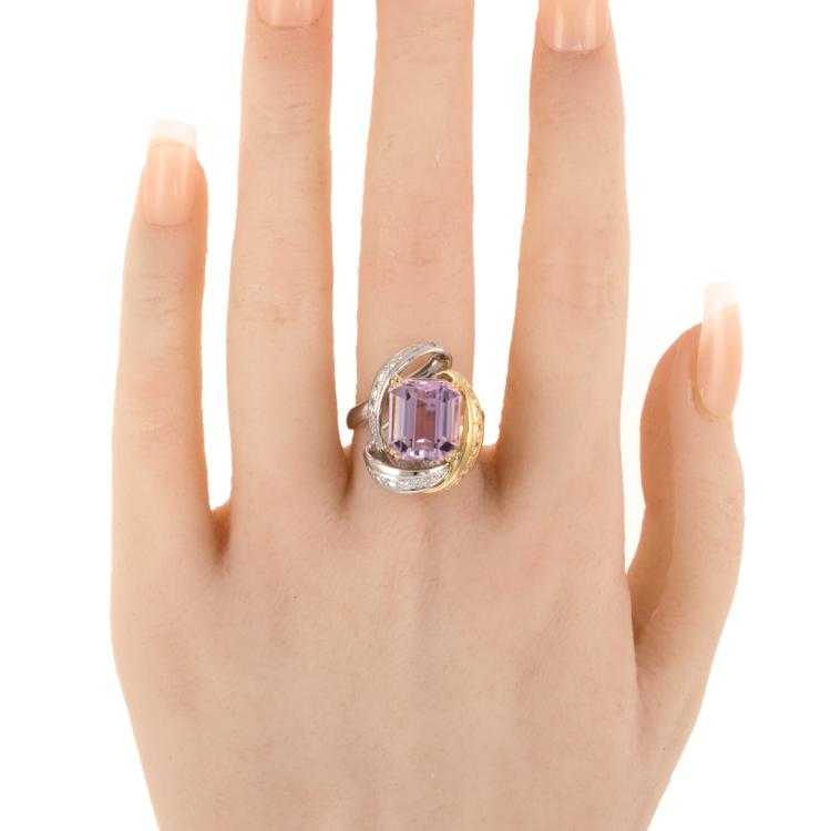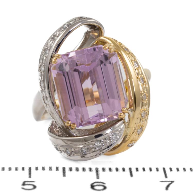 Kunzite and Diamond ring with emerald cut natural Kunzite of 7.12ct and round natural Diamonds totalling 0.20ct. 18ct Yellow gold and platinum 900. Ring size: N. Band width: 2.6mm - 3.3mm. Weight: 11.5g. (Pre-owned)