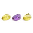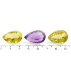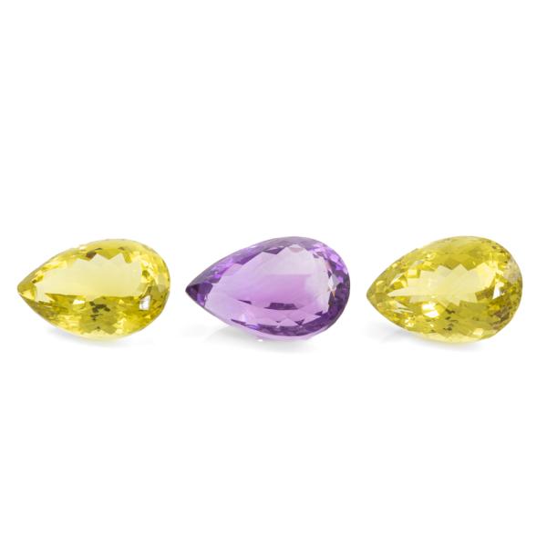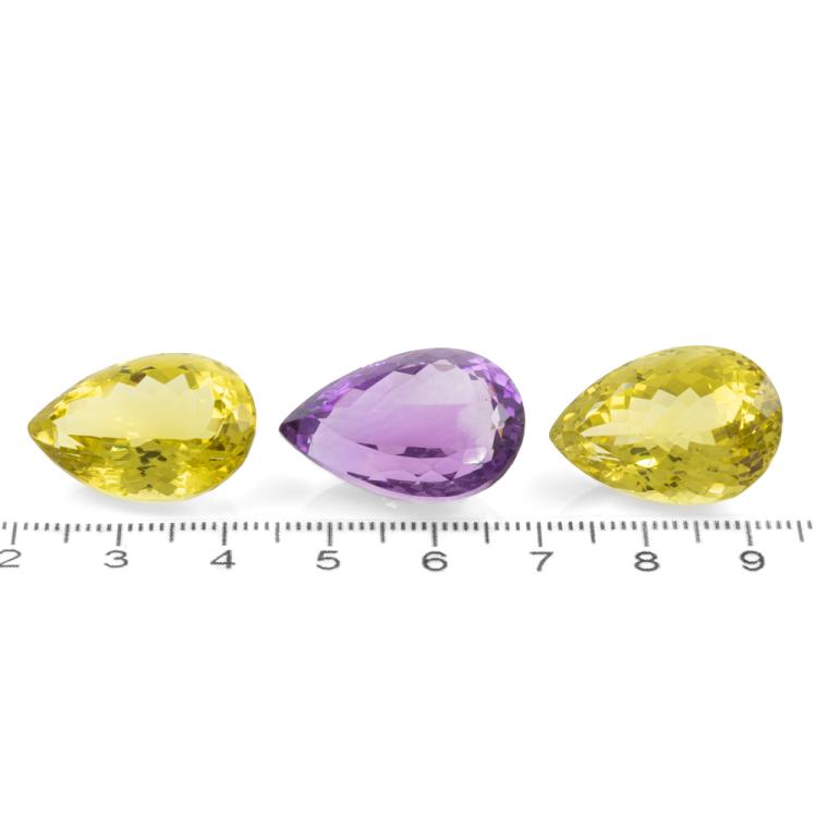 Parcel of 2 Loose pear shape natural Peridots totalling 46.10ct and one pear shape Amethyst of 25.83ct. Pear shape Peridots of size approximately: 22.54mm x 15.45mm x 10.85mm, 22.86mm x 15.63mm x 12.72mm. Pear shape Amethyst size approximately; 23.90mm x 16.21mm x 11.24mm. (New)