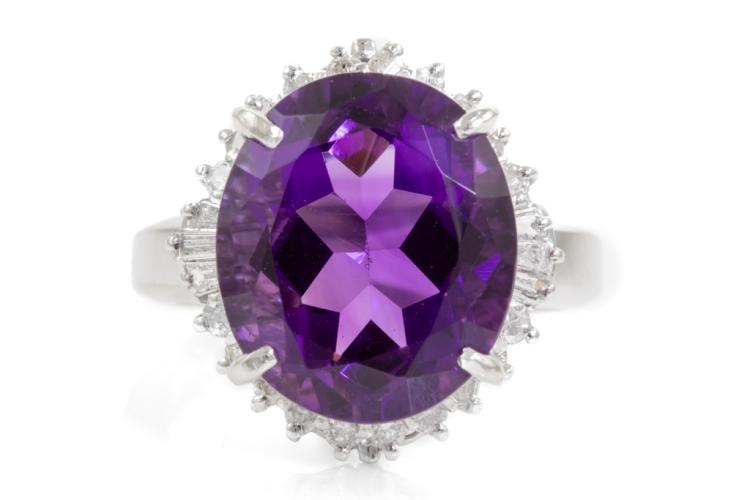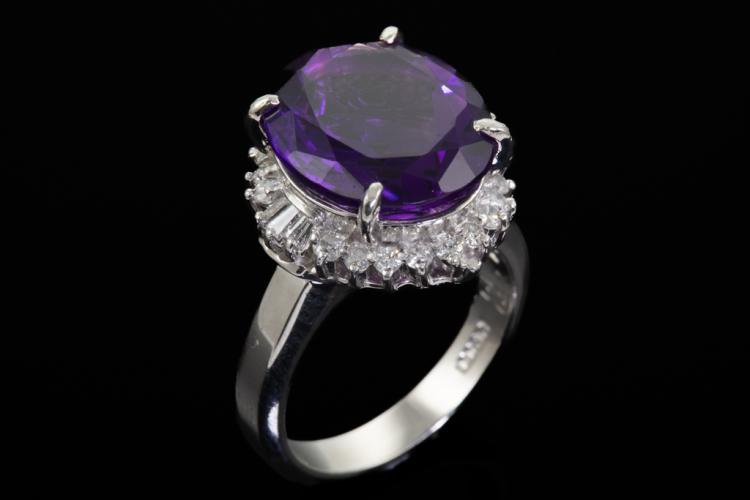 Amethyst and Diamond ring with oval shape Natural Amethyst of 7.39ct and round & baguette cut Natural Diamonds totalling 0.49ct (Estimated grading: H-I SI-P2). Platinum 900. Ring size L. Weight: 11.8g. (Pre-owned)