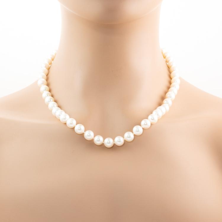 Pearl necklace with 48 Akoya Pearls of 8.5mm - 9.0mm. 14ct white gold ball clasp. Length: 47cm. Weight: 46.1g. (Pre-owned)