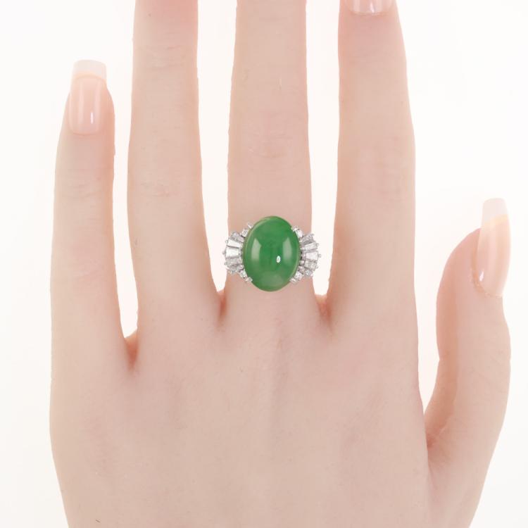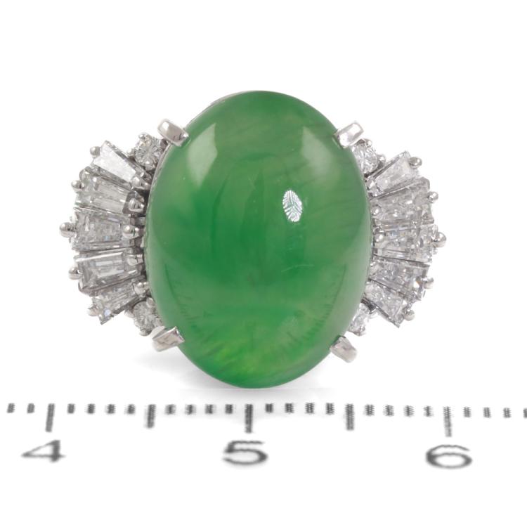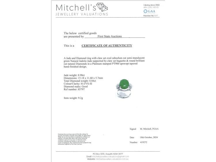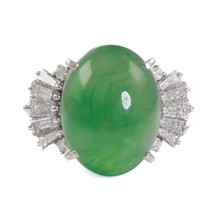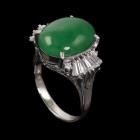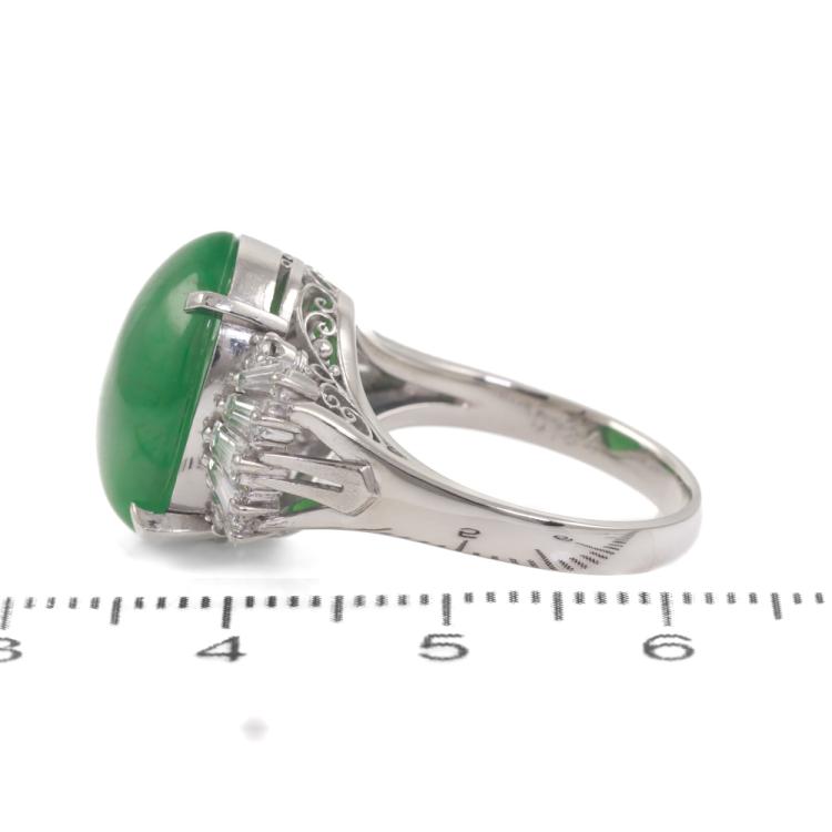 Jade and Diamond ring with oval cabochon cut green Natural Jadeite Jade - Type A of 8.98ct with round & baguette cut Natural Diamonds totalling 0.84ct (Estimated grading: H-I VS-SI).). Platinum 900. Ring size L1/2. Band width: 2.5 - 3.4mm. Weight: 9.2g. With Certificate #419272 (Pre-owned)