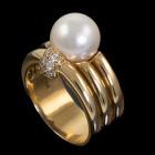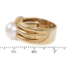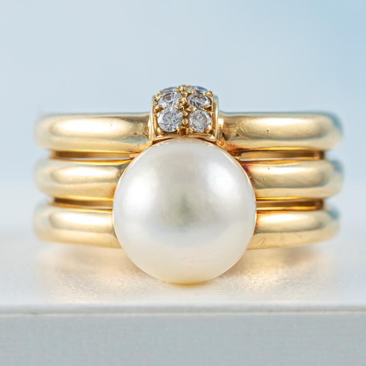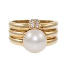 Pearl and Diamond ring with South Sea Pearl of 9.8mm and 6 round natural Diamonds totalling approximately 0.12ct. 18ct yellow gold. Ring size: N1/2. Band width: 8.2mm - 9.2mm. Weight: 12.0g. (Pre-Owned)