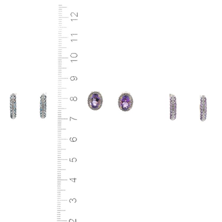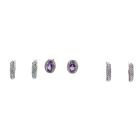 Three piece Amethyst and blue Topaz set: incl. 1) Amethyst stud earrings with oval shape Natural Amethyst of approx. 1.50ct (7.0mm x 5.0mm) & Natural Diamonds totalling 0.10ct. 2) Amethyst hoop earrings with Natural Amethyst totalling approx. 0.24ct (1.5mm) & Natural diamonds of 0.10ct. 3) Topaz hoop earrings with Natural blue Topaz of approx. 0.32ct (1.5mm) & diamonds totalling 0.10ct. All 9ct yellow and white gold. Combined weight: 5.8g (As new)