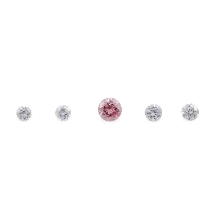 A parcel of 5 round brilliant cut Argyle Natural Diamonds with 1 round brilliant cut Argyle Pink Natural Diamond of 0.051ct (with GSL Report graded as Natural Fancy Vivid Purplish Pink #AA69050/1, Origin: Argyle Deposit, Western Australian) & 4 round Argyle Blue Natural Diamonds totalling 0.08cts (1 x 0.023ct With GSL Report graded as Natural Fancy Intense Greyish Blue SI2 # AA69050/2, Origin: Argyle Deposit, Western Australia). (As New)