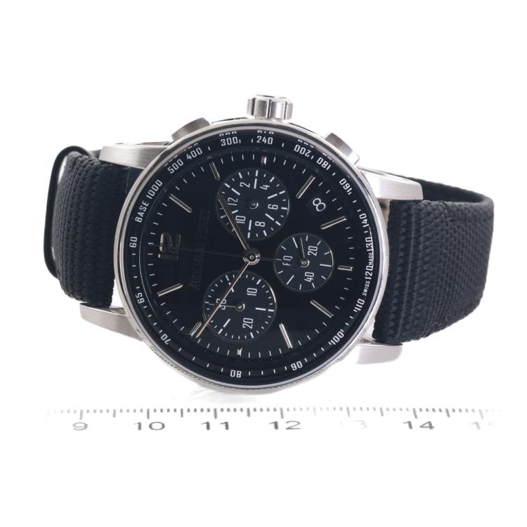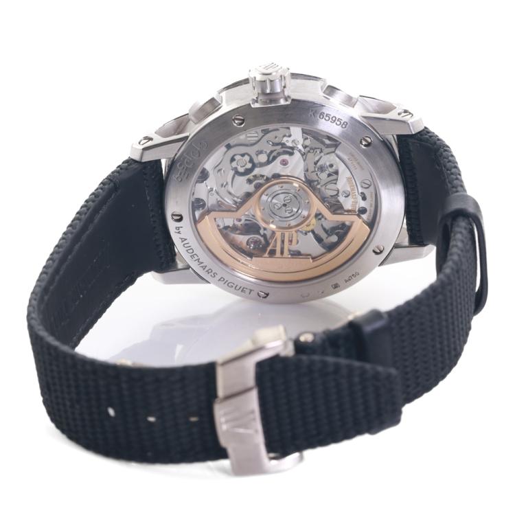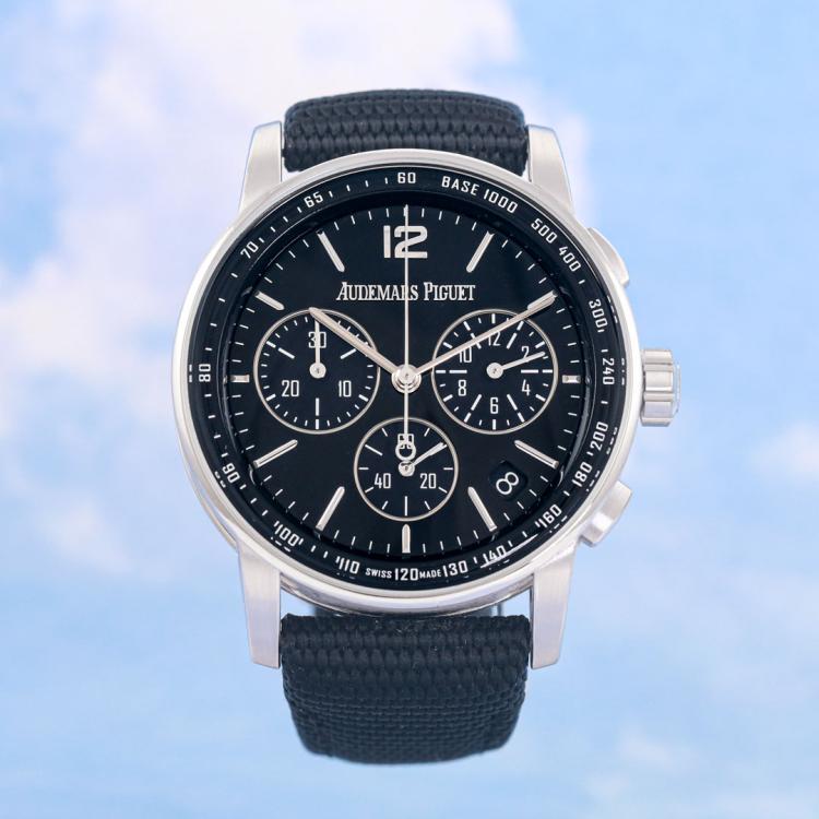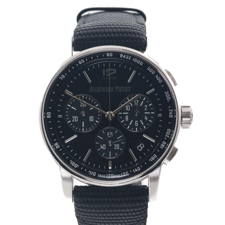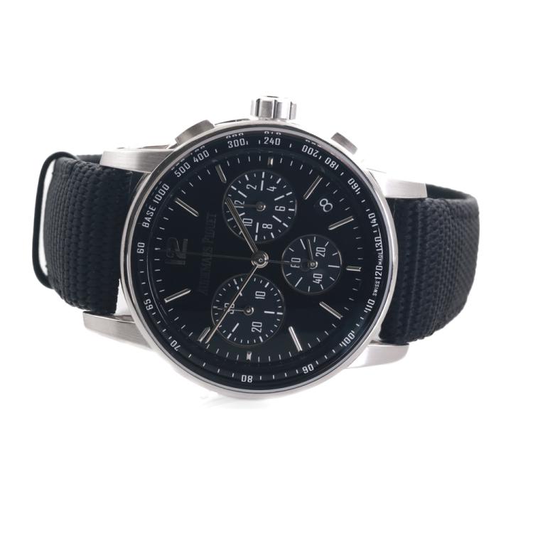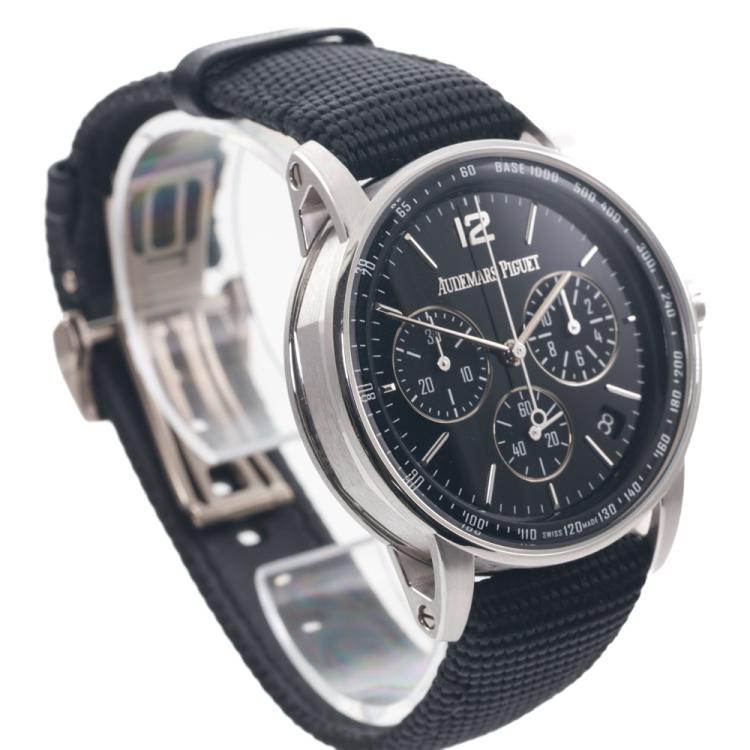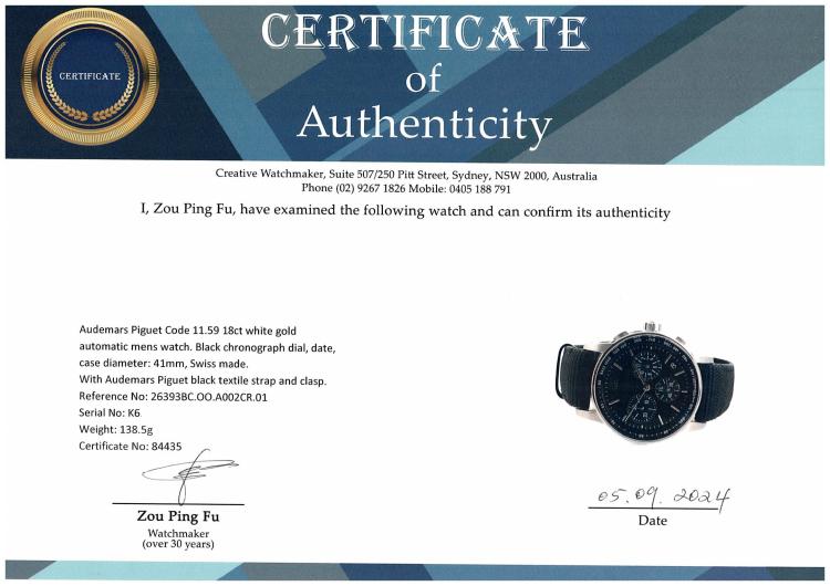 Audemars Piguet Code 11.59 18ct white gold automatic mens watch. Black chronograph dial, date, case diameter: 41mm, adjustable max wrist size: 19.5cm, Swiss made. Ref# 26393BC.OO.A002CR.01. With Audemars Piguet black textile strap and clasp. With Certificate of Authenticity and spare Audemars Piguet black leather strap. 3 month FSA warranty (Pre-owned)