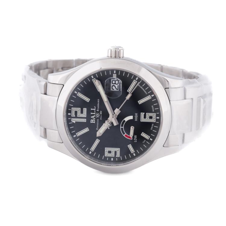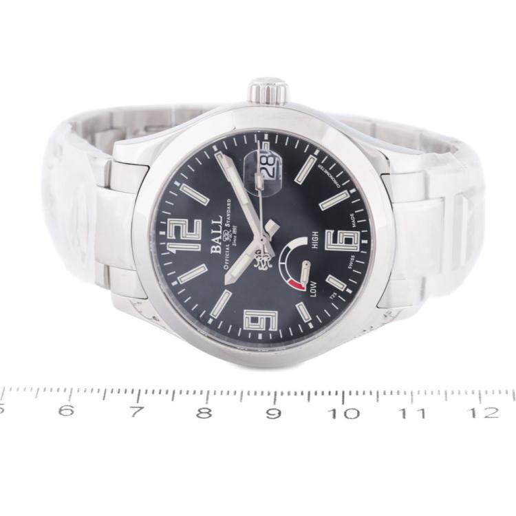 Ball Engineer III Pioneer Power Reserve stainless automatic watch. Black dial, power reserve subdial, date, case diameter: 40mm, wrist size: 18cm, Swiss made. Ref# PM9026C-SCJ-BK. With Ball stainless steel bracelet and clasp. With Ball Premium International Warranty Certificate card, Ball Chronometer Card and Ball box. 12 month FSA warranty (As new, Note: case and bracelet in original wrapping)