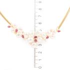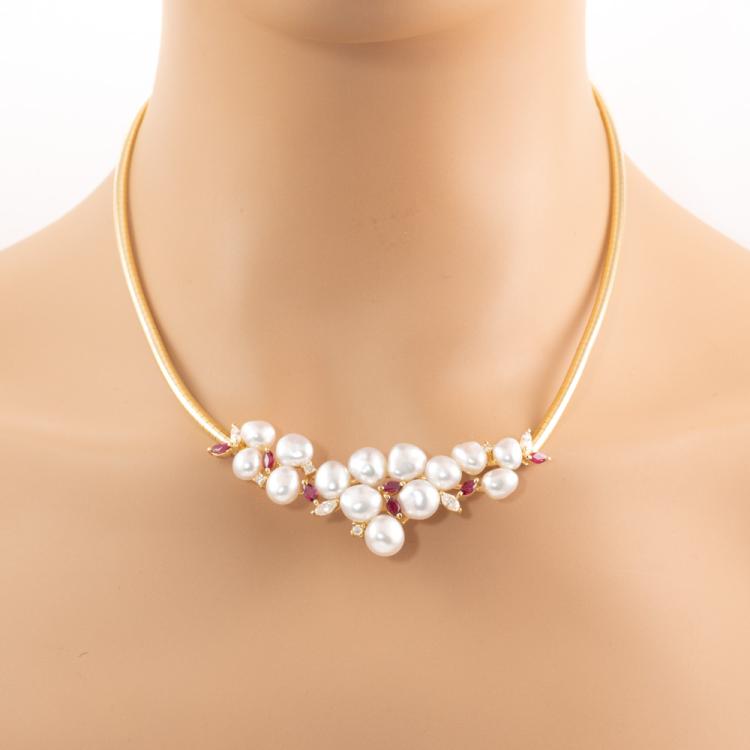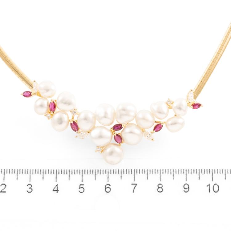 Pearl, Ruby and Diamond necklace with 14 Baroque Pearls of 6mm - 7.5mm, 7 marquise cut natural Rubies totalling 1.24ct and round natural Diamonds totalling 0.68ct (Estimated grading: H VS). 18ct yellow gold. Length: 42cm. Weight: 35.0g. With Certificate #418793. (Pre-owned)