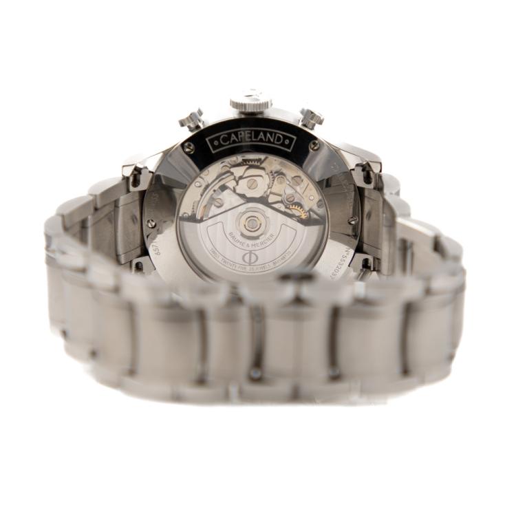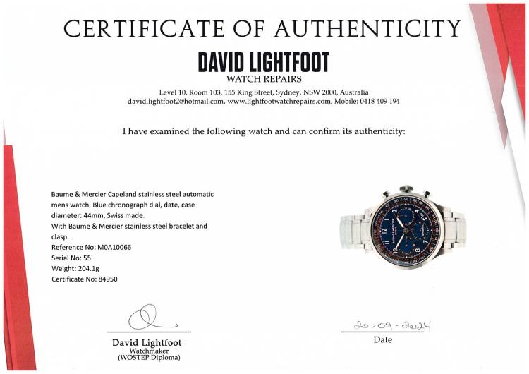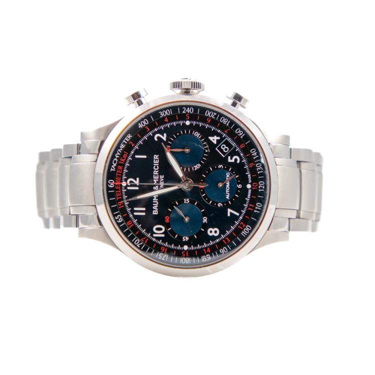 Baume & Mercier Capeland stainless steel automatic mens watch. Blue chronograph dial, date, case diameter: 44mm, wrist size: 21cm, Swiss made. Ref# M0A10066. With Baume & Mercier stainless steel bracelet and clasp. With Certificate of Authenticity, Baume & Mercier International Warranty card dated 05/11/2012 and Baume & Mercier box. 3 month FSA warranty. (Pre-owned)
