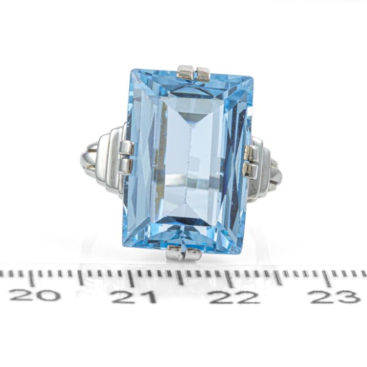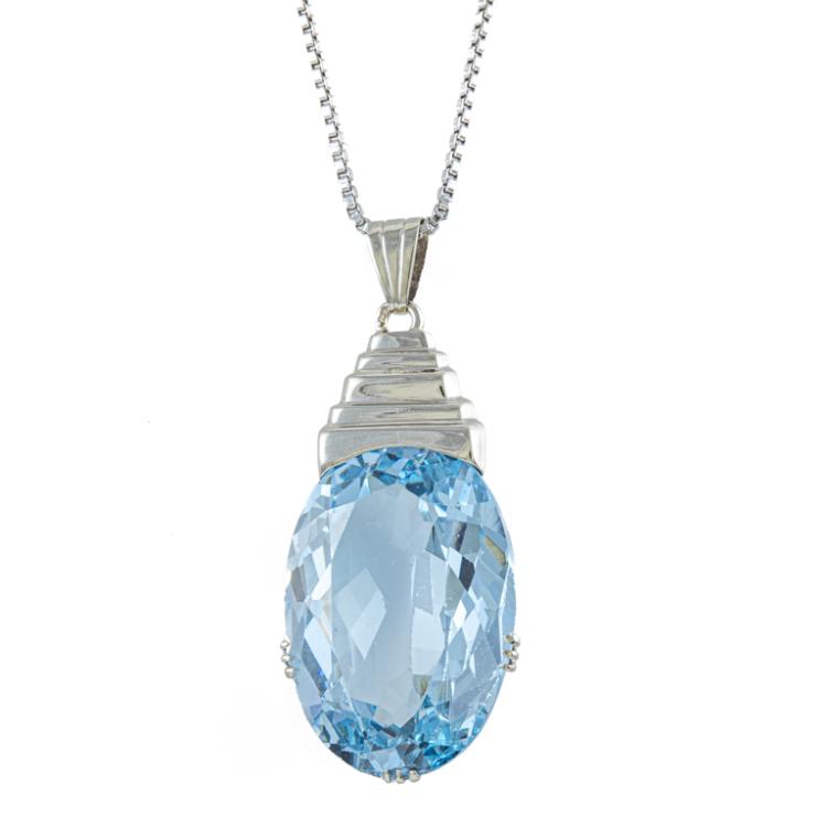 Topaz ring and pendant set. 1) Topaz ring with a step rectangular cut Natural blue Topaz of approximately 15.00ct. 14ct white gold (XRF tested, not stamped). Ring size: O. Band width: 1.2mm - 1.7mm. 2) Topaz pendant with oval shape Natural blue Topaz of approximately 17.00ct. 14ct white gold (XRF tested, not stamped) with 46cm 14ct white gold chain. Total weight: 15.2g. (Pre-owned)