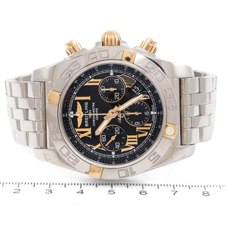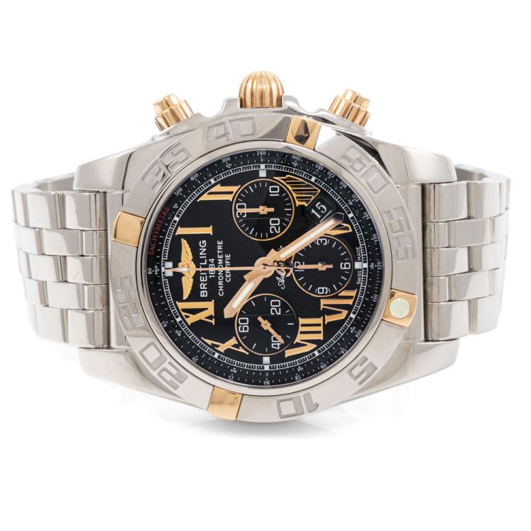 Breitling Chronomat 18ct rose gold and stainless steel automatic mens watch. Black chronograph dial, date, case diameter: 44mm, wrist size: 20cm, Swiss made. Ref# IB0110. With Breitling stainless steel bracelet and clasp. With Certificate of Authenticity, Breitling International Warranty booklet dated 21/03/2011 and Breitling box. 3 month FSA warranty (Pre-owned)
