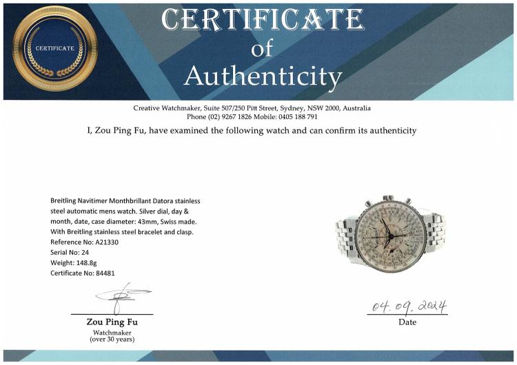 Breitling Navitimer Monthbrillant Datora stainless steel automatic mens watch. Silver dial, day & month, date, case diameter: 43mm, wrist size: 16.5cm, Swiss made. Ref# A21330. With Breitling stainless steel bracelet and clasp. With Certificate of Authenticity and Breitling box. 3 month FSA warranty (Pre-owned)