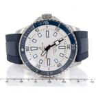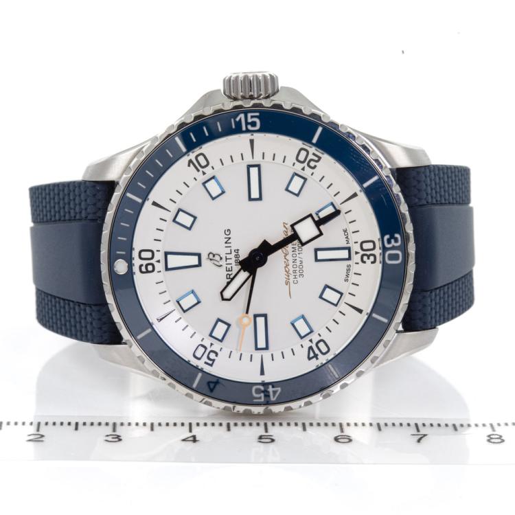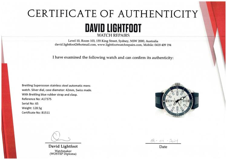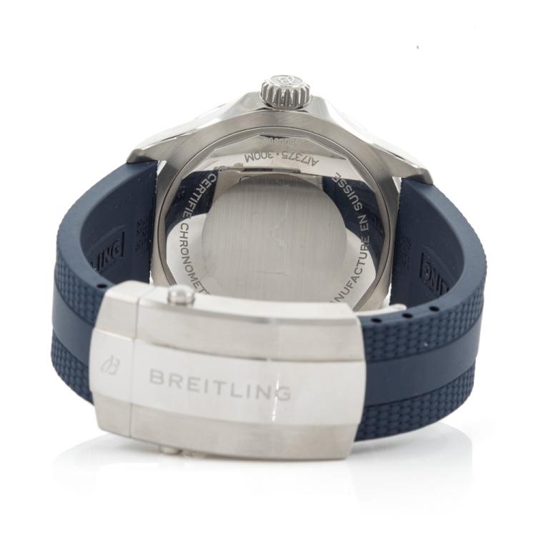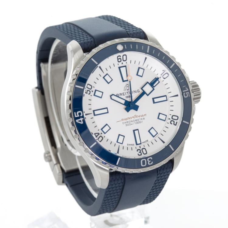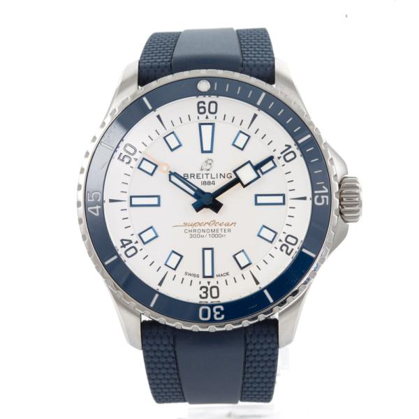 Breitling Superocean stainless steel automatic mens watch. Silver dial, case diameter: 42mm, wrist size: 17cm, Swiss made. Ref# A17375. With Breitling blue rubber strap and clasp. With Certificate of Authenticity and Breitling Card Holder and Breitling case. 3 month FSA warranty (Pre-owned)