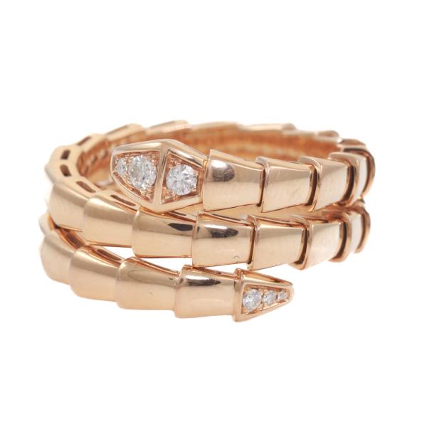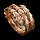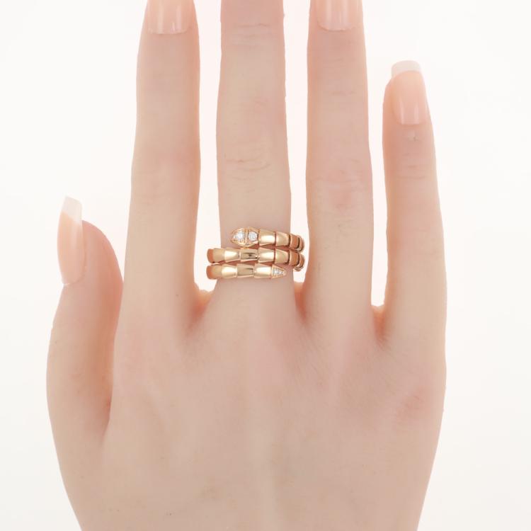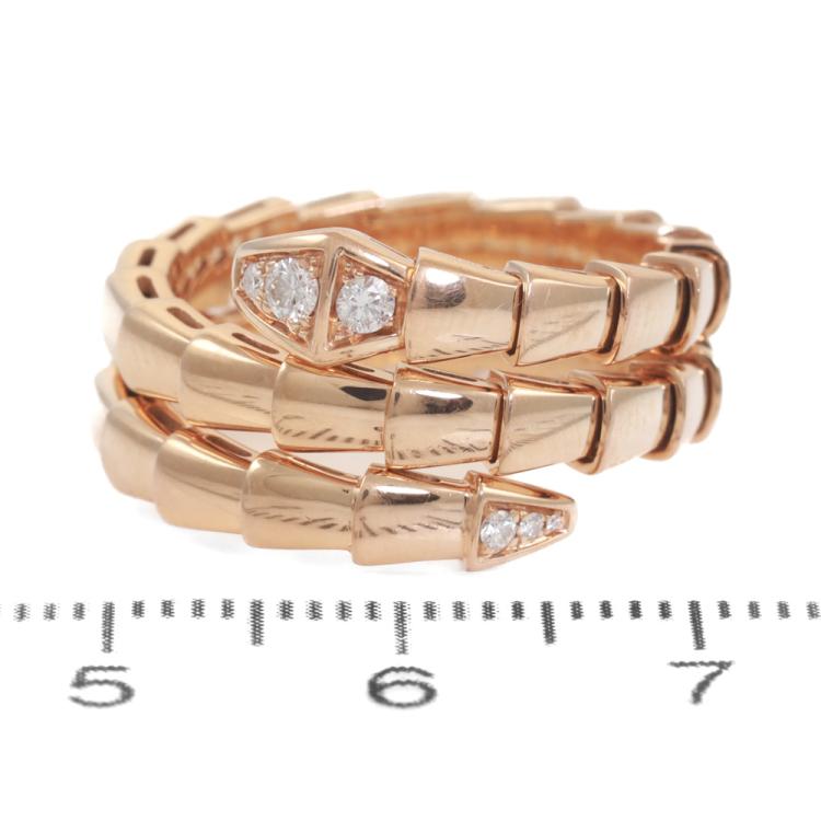 Bvlgari Serpenti Viper Diamond ring with 6 round Natural Diamonds totalling 0.10ct. 18ct rose gold. Made in Italy. Stamped size Large; equivalent to ring size N, - ring resizing is not recommended. Weight: 10.3g. With Bvlgari box, Bvlgari Authenticity certificate dated 27/04/23 and Bvlgari receipt dated 27/04/23. (Pre-owned)