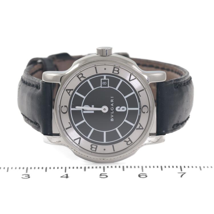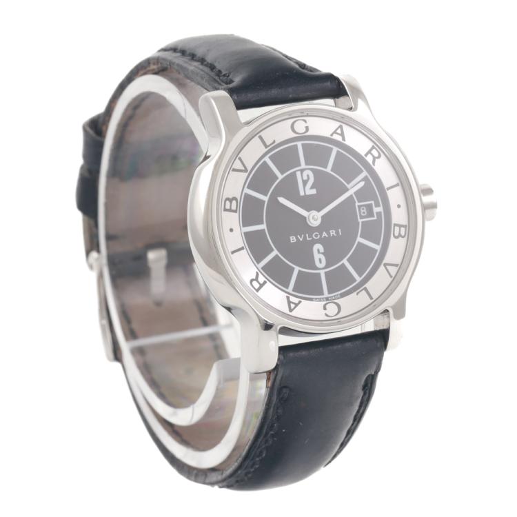 Bvlgari Solotempo stainless steel quartz ladies watch. Silver & black dial, date, case diameter: 29mm, strap length including case: 17cm, Swiss made. Ref# ST29S. With Bvlgari black leather strap and buckle. With Certificate of Authenticity and Bvlgari box. 3 month FSA warranty (Pre-owned)