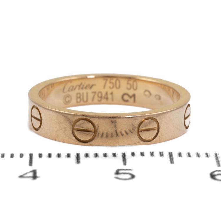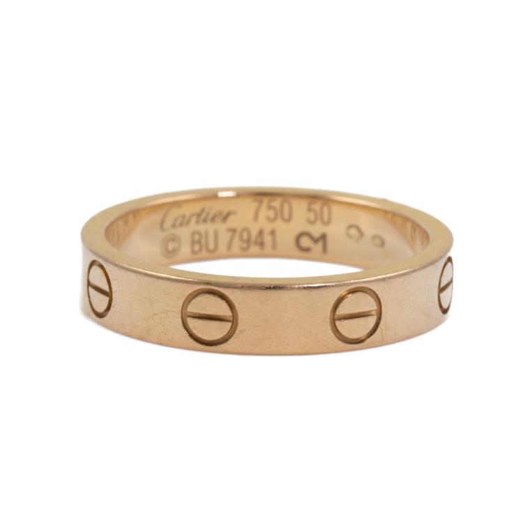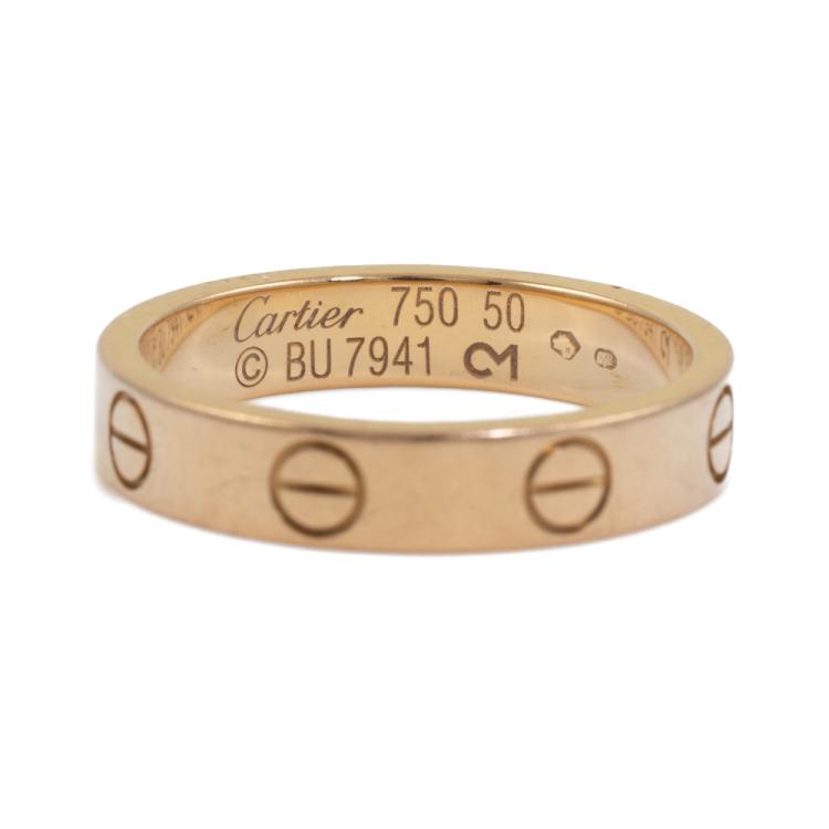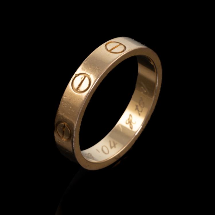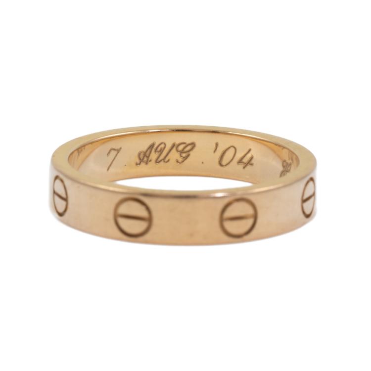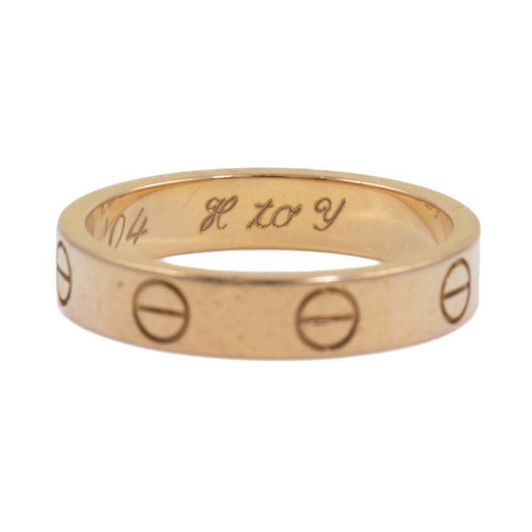 Cartier Love wedding band. 18ct rose gold. Cartier stamped size 50, actual size J1/2 - ring resizing is not recommended. Band width: 3.6mm. With engraving: "7 Aug 04 K to Y" inside band. Weight: 3.8g. (Pre-owned)